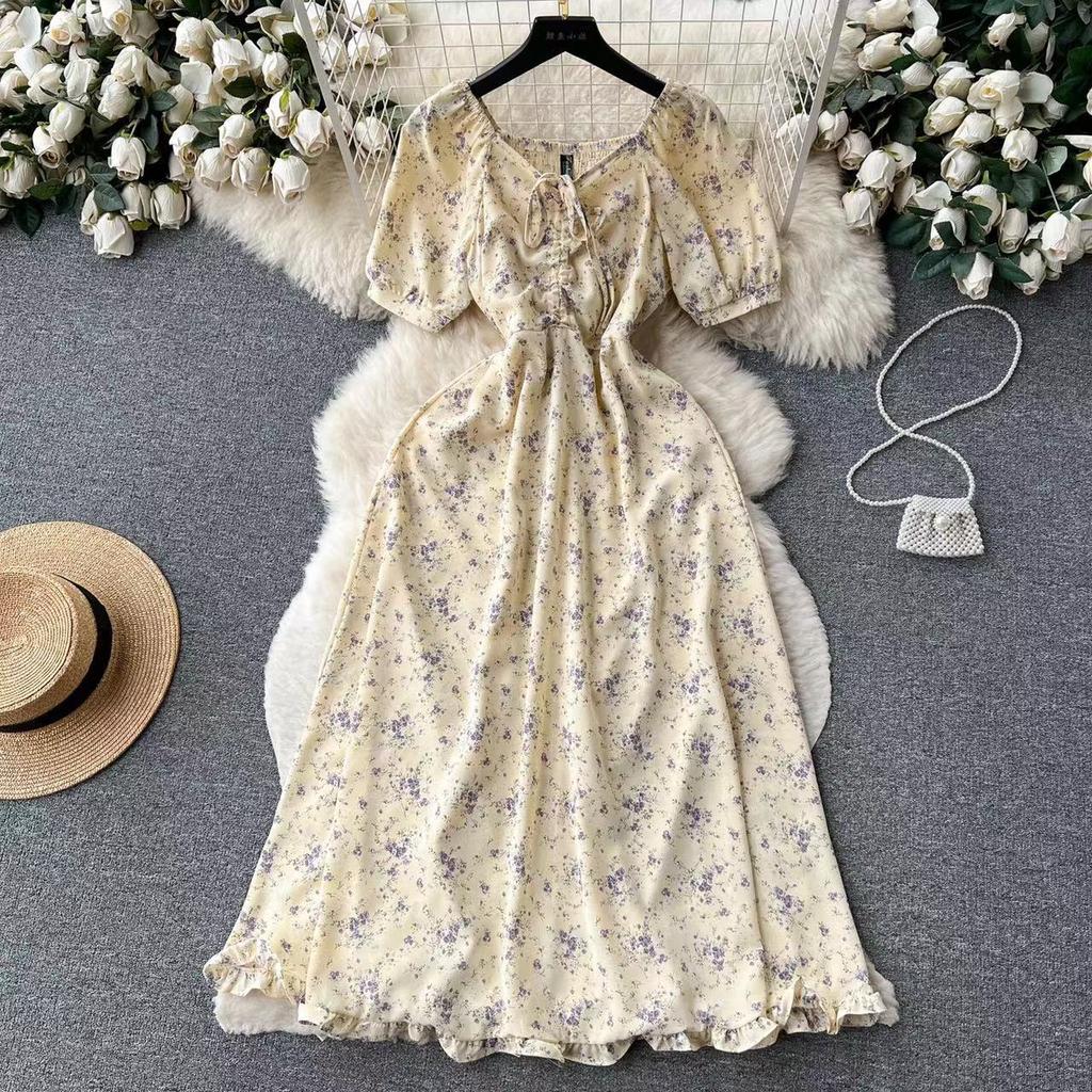 Летнее женское платье миди с цветочным принтом, пляжный отдых, v-образный вырез, короткий рукав, трапециевидная форма с высокой талией, вечерние женские платья