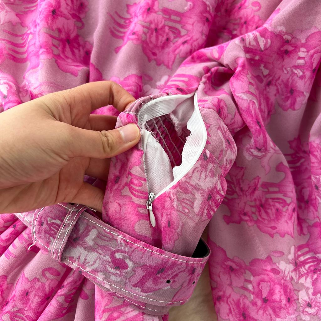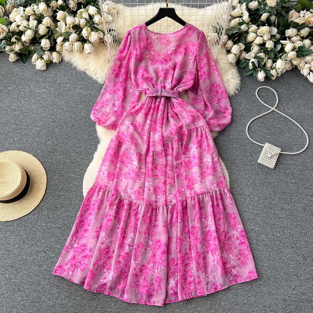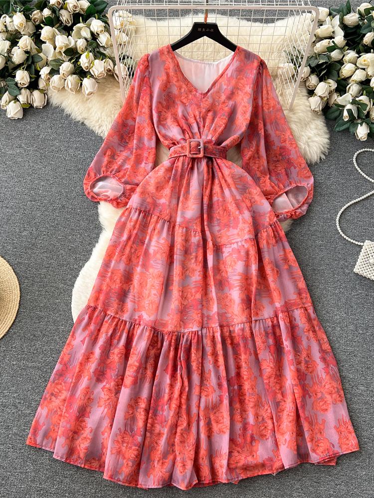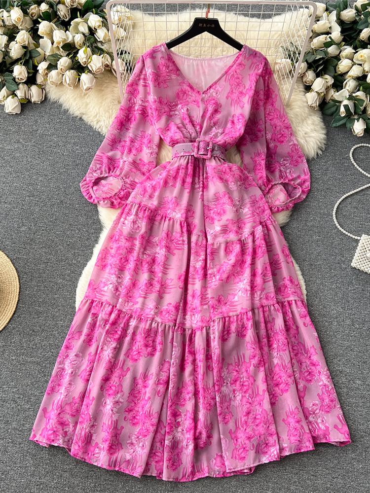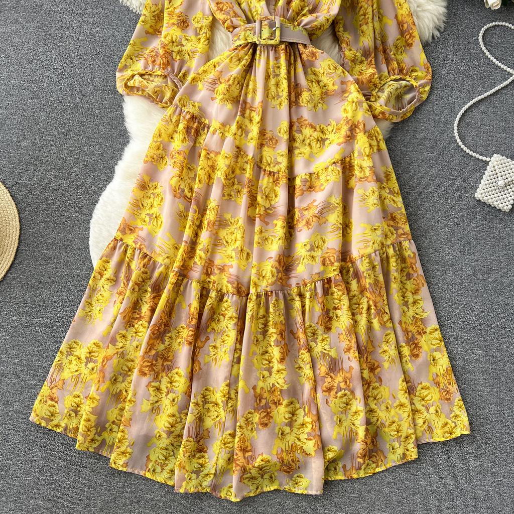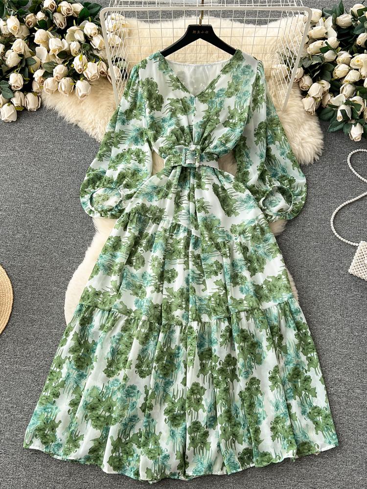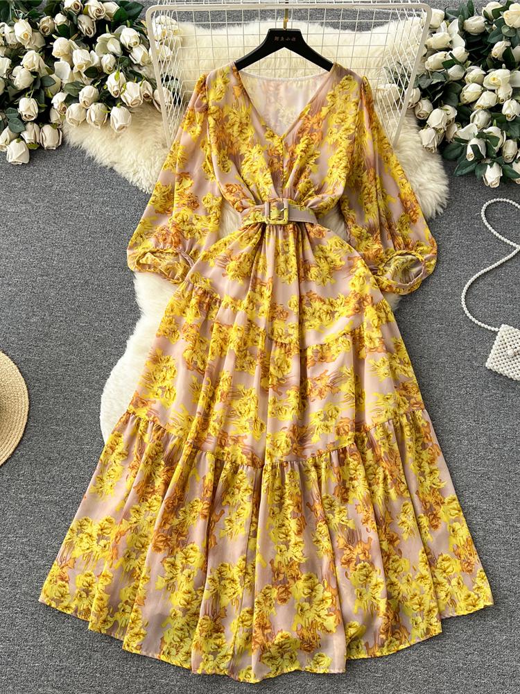 Осеннее винтажное женское платье миди с цветочным принтом, элегантное платье трапециевидной формы с v-образным вырезом и длинными рукавами и рюшами по подолу для женщин
