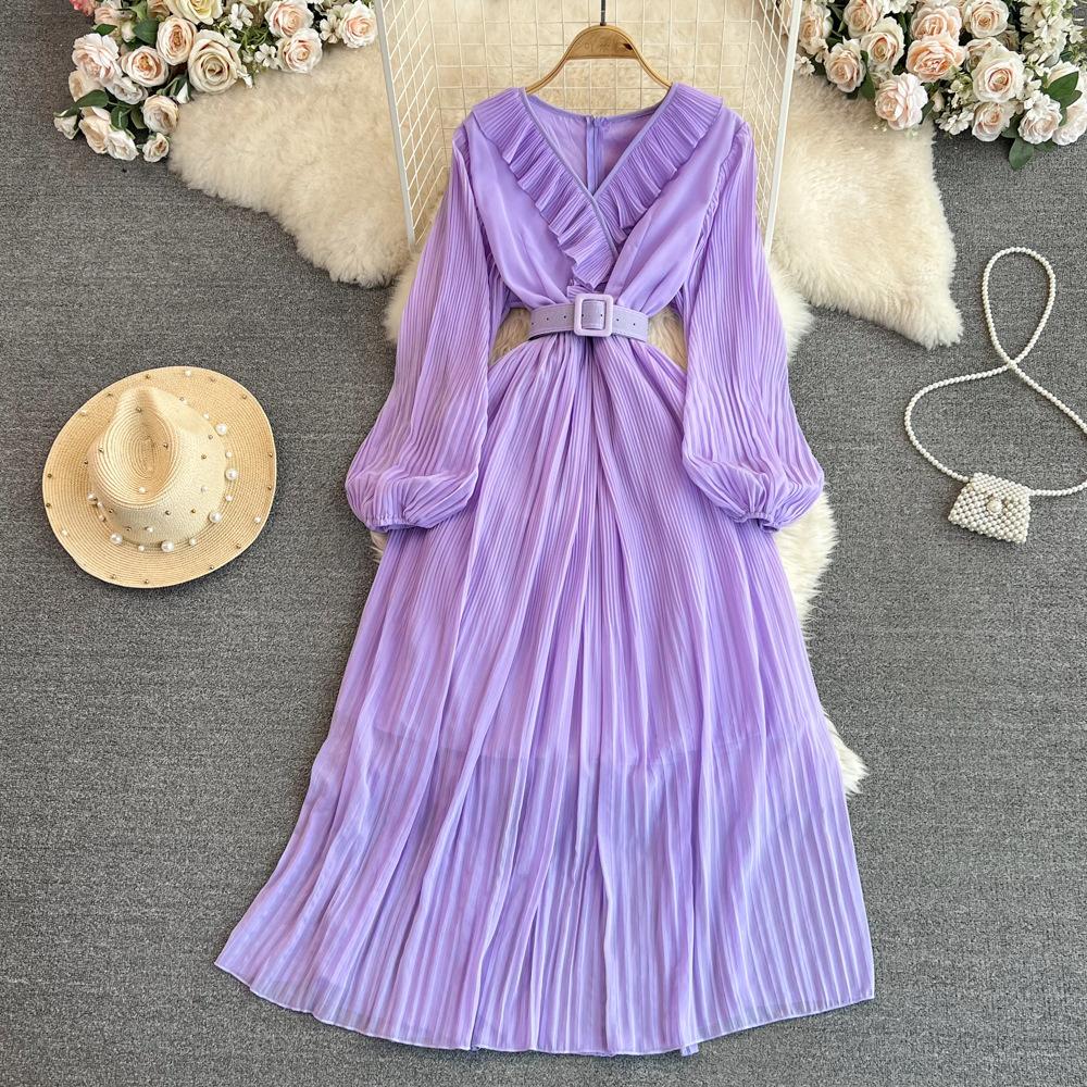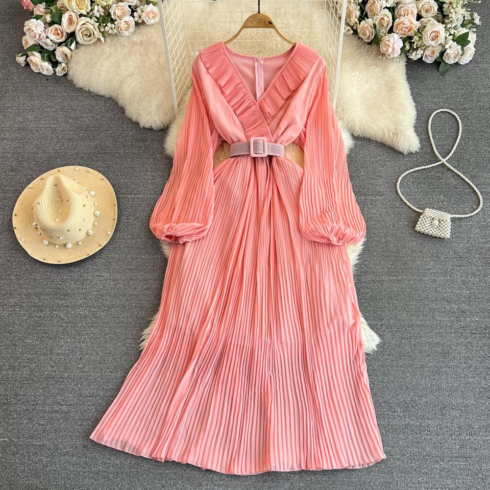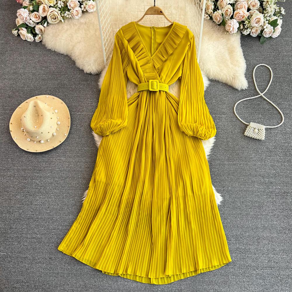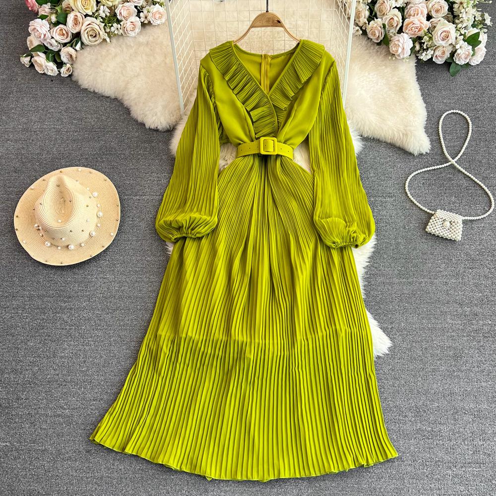 Винтажные весенне-осенние платья, плиссированное платье трапециевидной формы с длинными рукавами и v-образным вырезом, пляжное платье трапециевидной формы с рюшами