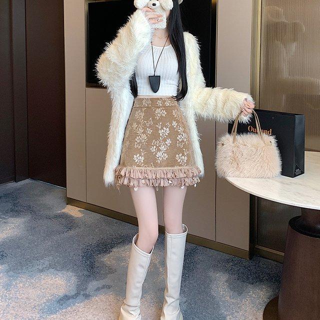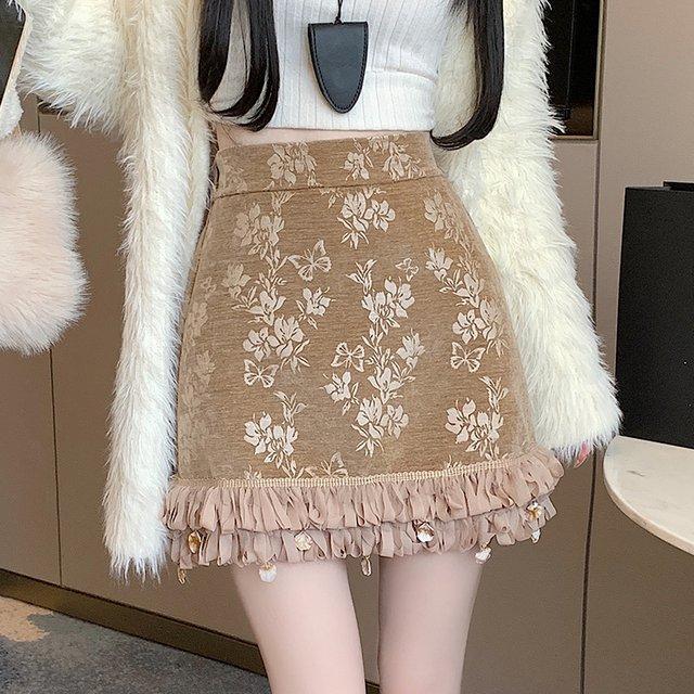 Юбка-трапеция с французским лифом, оборками и высокой талией, жаккардовая, облегающая, миди