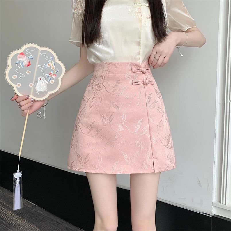 Облегающая мини-юбка с разрезом, женская летняя жаккардовая юбка-миди с пуговицами в неокитайском стиле, непрозрачная, с высокой талией, утягивающая, А-силуэт