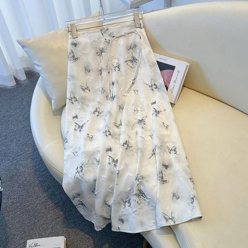 Юбка миди с принтом бабочек в китайском стиле, женская летняя жаккардовая юбка с пуговицами в неокитайском стиле, длинная юбка А-силуэта с цветочным принтом, элегантная, с высокой талией