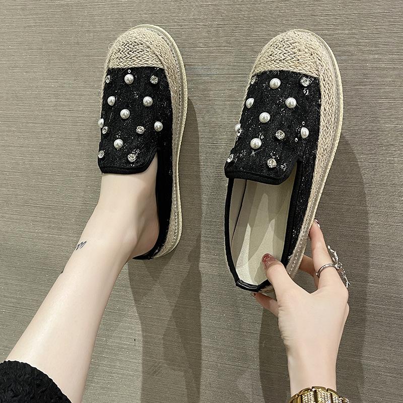 Соломенные тапочки-рыбаки женские 2025 лето новые баотоу низкий каблук плоская подошва стразы цветы досуг интернет-знаменитость полубосоножки женские