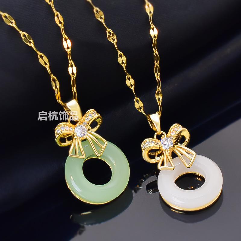 Нефрит Хэтянь Подвеска-пряжка безопасности Женское ожерелье в ретро этническом стиле Универсальное Слегка инкрустированное бантом Подвеска Цепочка на шею