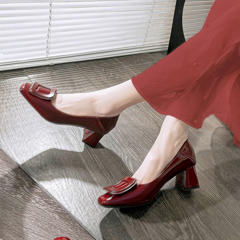 Женские туфли-лодочки с квадратным носком и неглубоким вырезом, на среднем каблуке, новая женская обувь 2025 года, весна-осень, французские туфли на высоком каблуке, толстый каблук, красные свадебные туфли