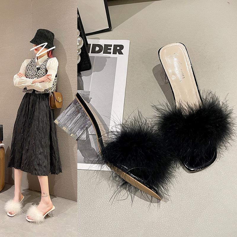 2025 лето новые шлепанцы на толстом каблуке женская обувь квадратный носок открытый носок пушистые шлепанцы на одном ремешке модные туфли на высоком каблуке