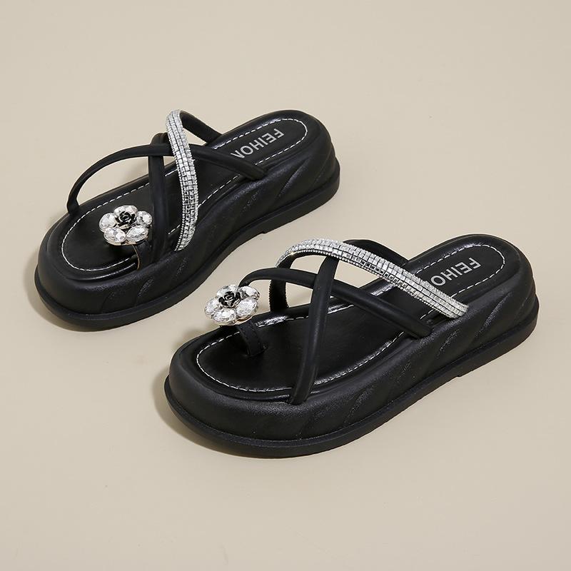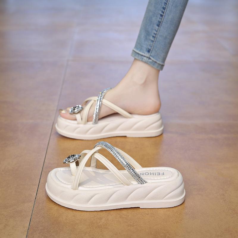 Шлепанцы на толстой подошве женские летние модные французские с перемычкой для пальцев сандалии высокого класса со стразами темперамент красивая стопа пляж