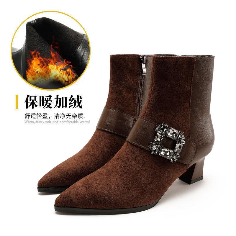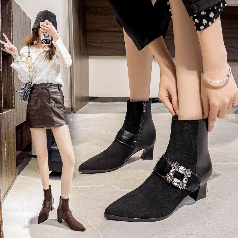 Короткие сапоги с острым носком на высоком каблуке 2024 года, осень-зима, новые сапоги с боковой молнией, толстый каблук, тонкие сапоги, французская пряжка со стразами, женские сапоги среднего размера