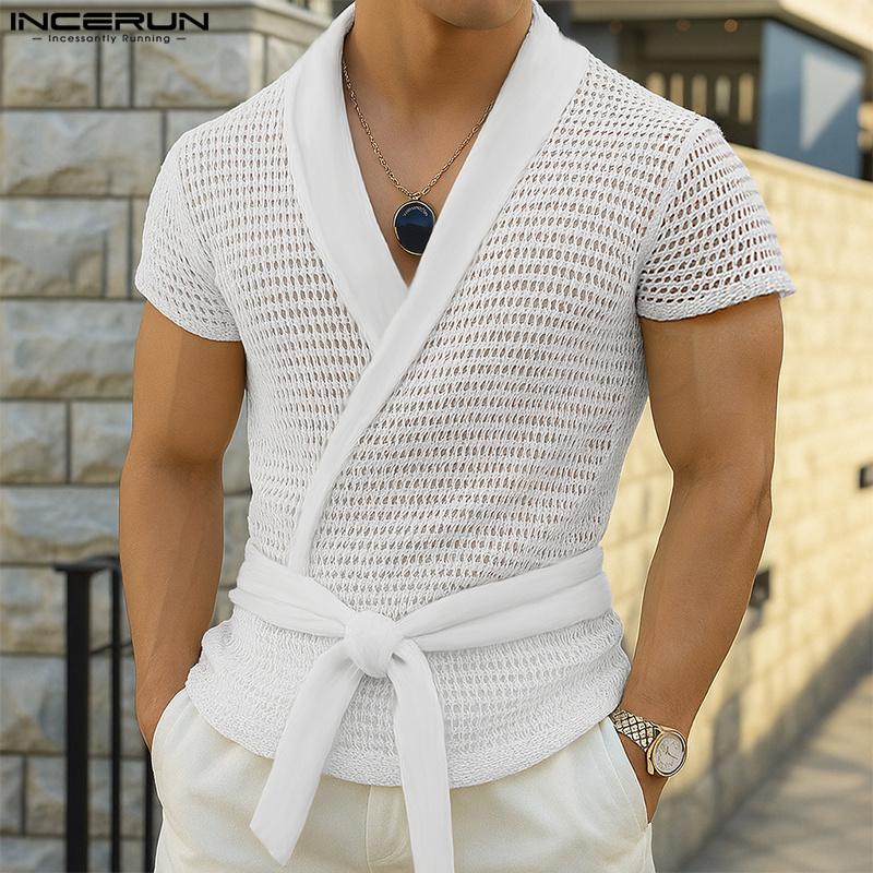 INCERUN Мужские пляжные футболки с V-образным вырезом и коротким рукавом, ажурной отделкой спереди и перекрестными повязками
