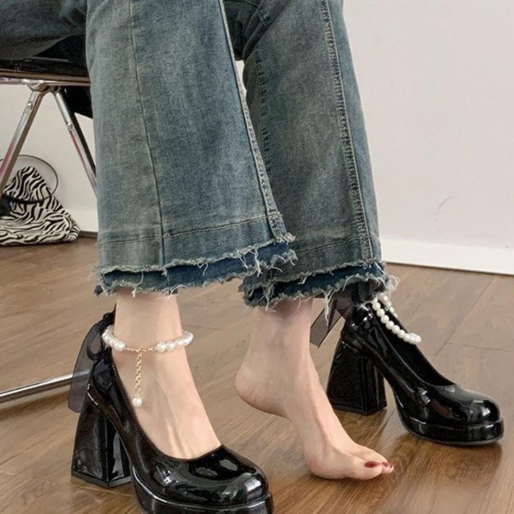 Туфли в стиле Лолита Женские Туфли на каблуке в японском стиле Мэри Джейн Женские Туфли на платформе с ремешком на щиколотке и жемчугом в стиле ретро Chaussure Femme