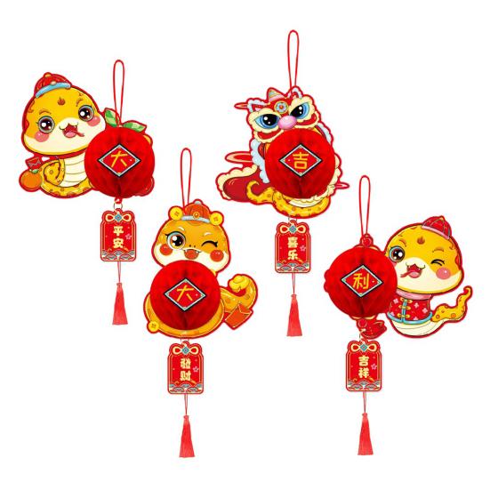 Украсьте празднование Весеннего фестиваля этими четырьмя изысканными декоративными подвесками с уникальным дизайном традиционных элементов, таких как львы, змеи и золотые слитки.. Изготовленные из высококачественных бумажных материалов, эти подвески не только безопасны и долговечны, но и прекрасно детализированы, добавив праздничный штрих к вашему интерьеру.. Мультяшный дизайн змеи, украшенный китайскими благословениями, излучает очаровательную новогоднюю атмосферу, что делает его идеальным дополнением к мероприятиям и вечеринкам в честь Весеннего фестиваля..