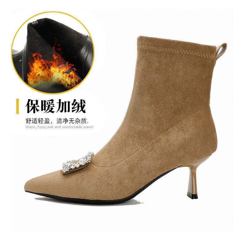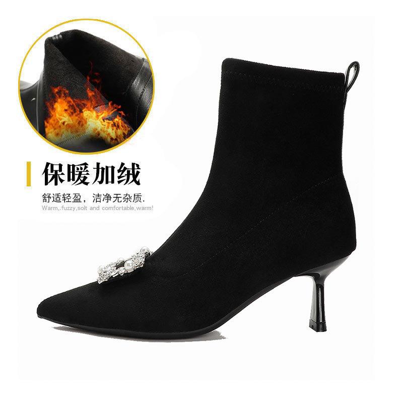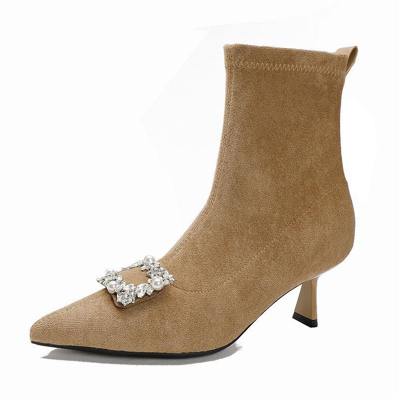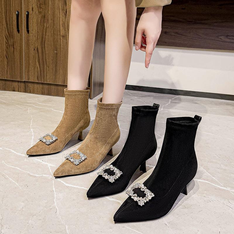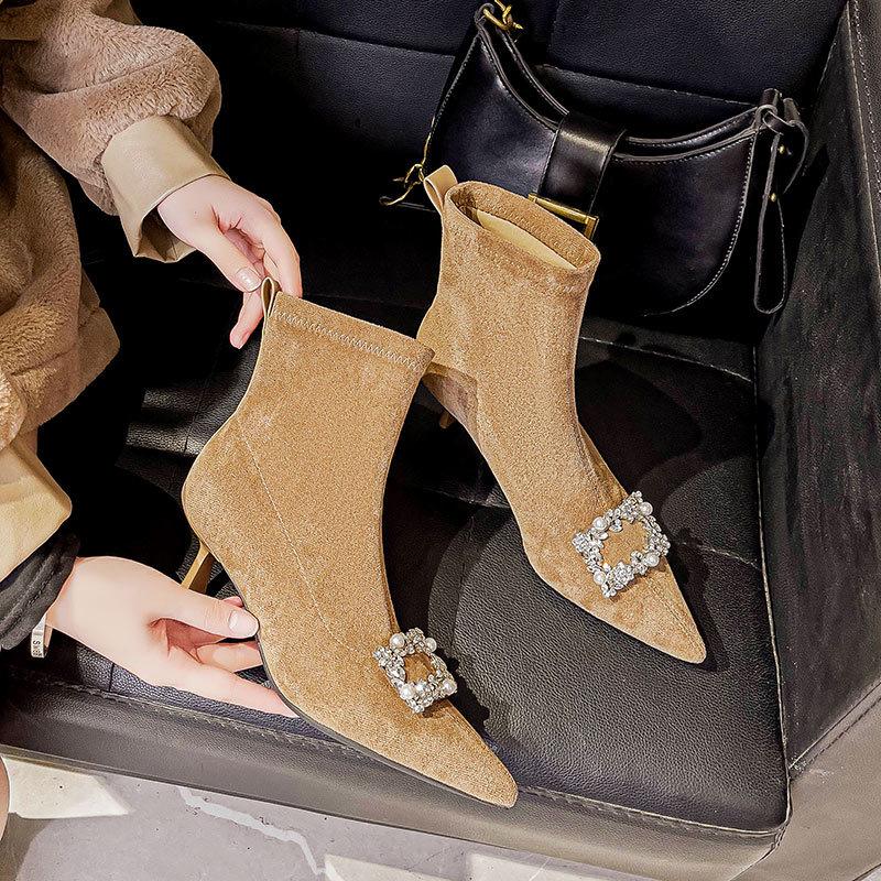 Короткие сапоги на высоком каблуке, заостренные эластичные тонкие сапоги, новинка 2024 года, со стразами, квадратной пряжкой, тонкий каблук, сапоги средней длины, модные сапоги