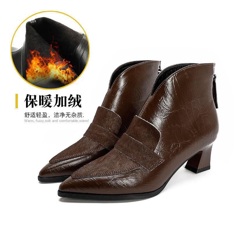 Короткие заостренные сапоги женские на толстом каблуке из кожи с конским волосом коричневые ретро короткие сапоги кожаные сапоги на высоком каблуке осенне-зимние новые высокие туфли женские