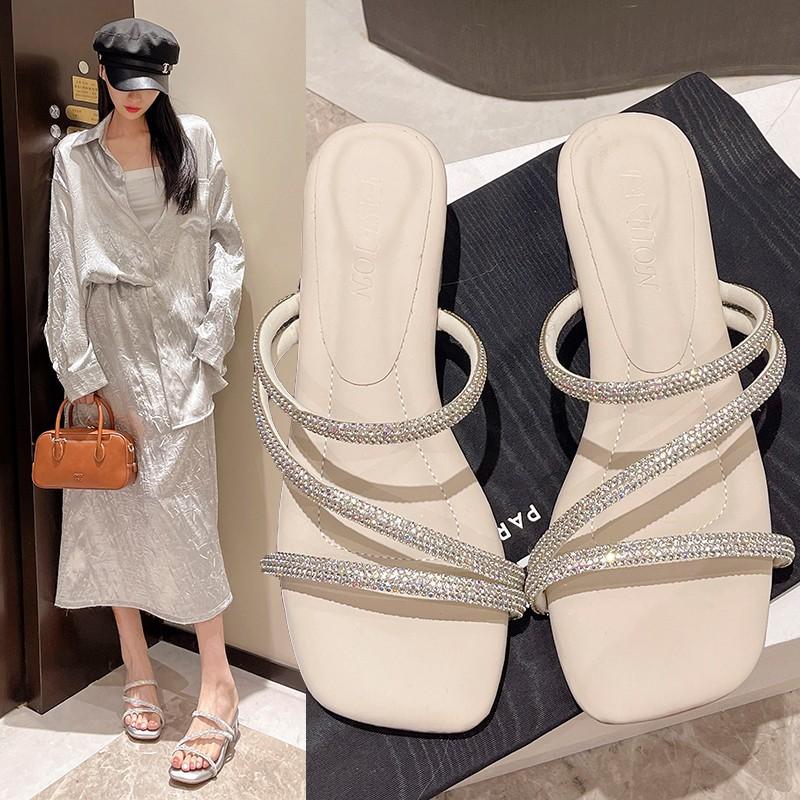 Slippers women's summer 2025 new French rhinestones one-word sandals square heel open-toed fashion high heels