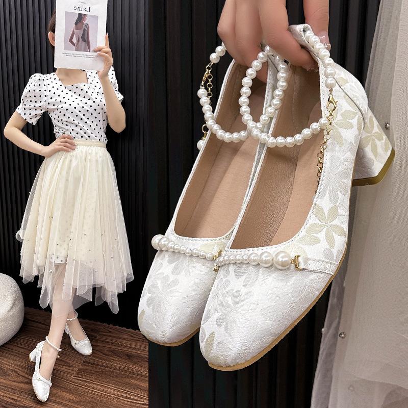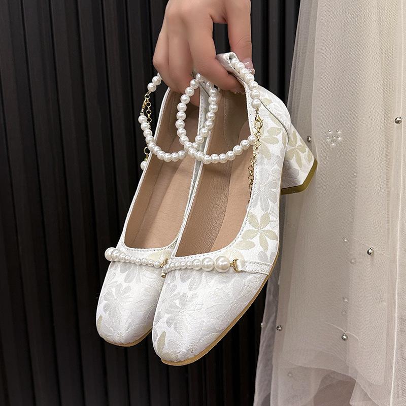 Женские туфли на высоком каблуке 2024 новые китайские туфли Мэри Джейн в античном стиле с жемчужной цепочкой, квадратным носком, с открытым верхом, на толстом каблуке, одинарные туфли женские