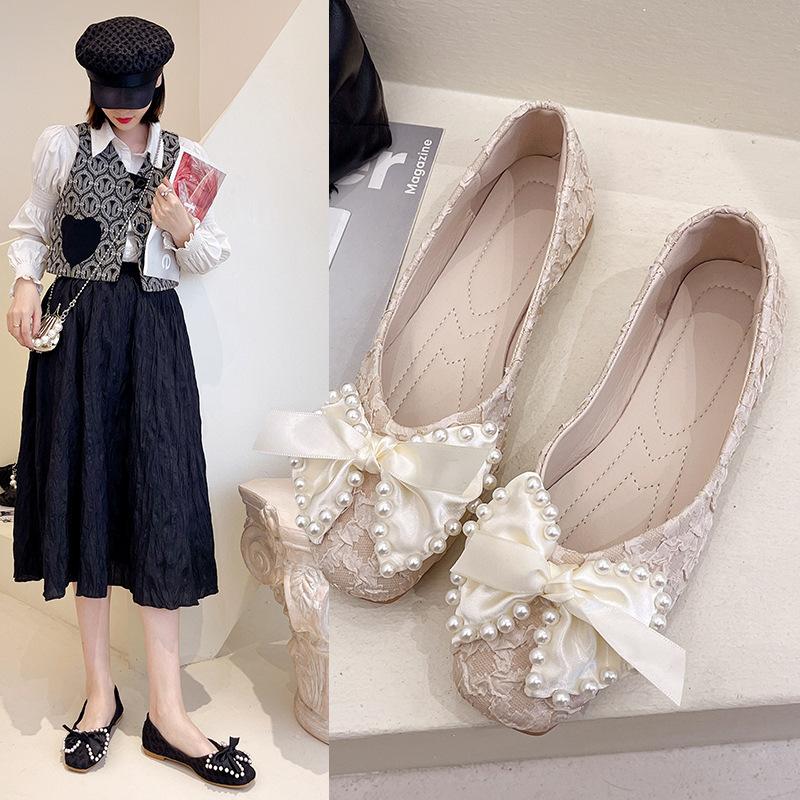 Одиночные туфли женские летние 2024 новые модные универсальные ретро бант жемчужные неглубокие горловины квадратной формы нескользящие туфли Doudou