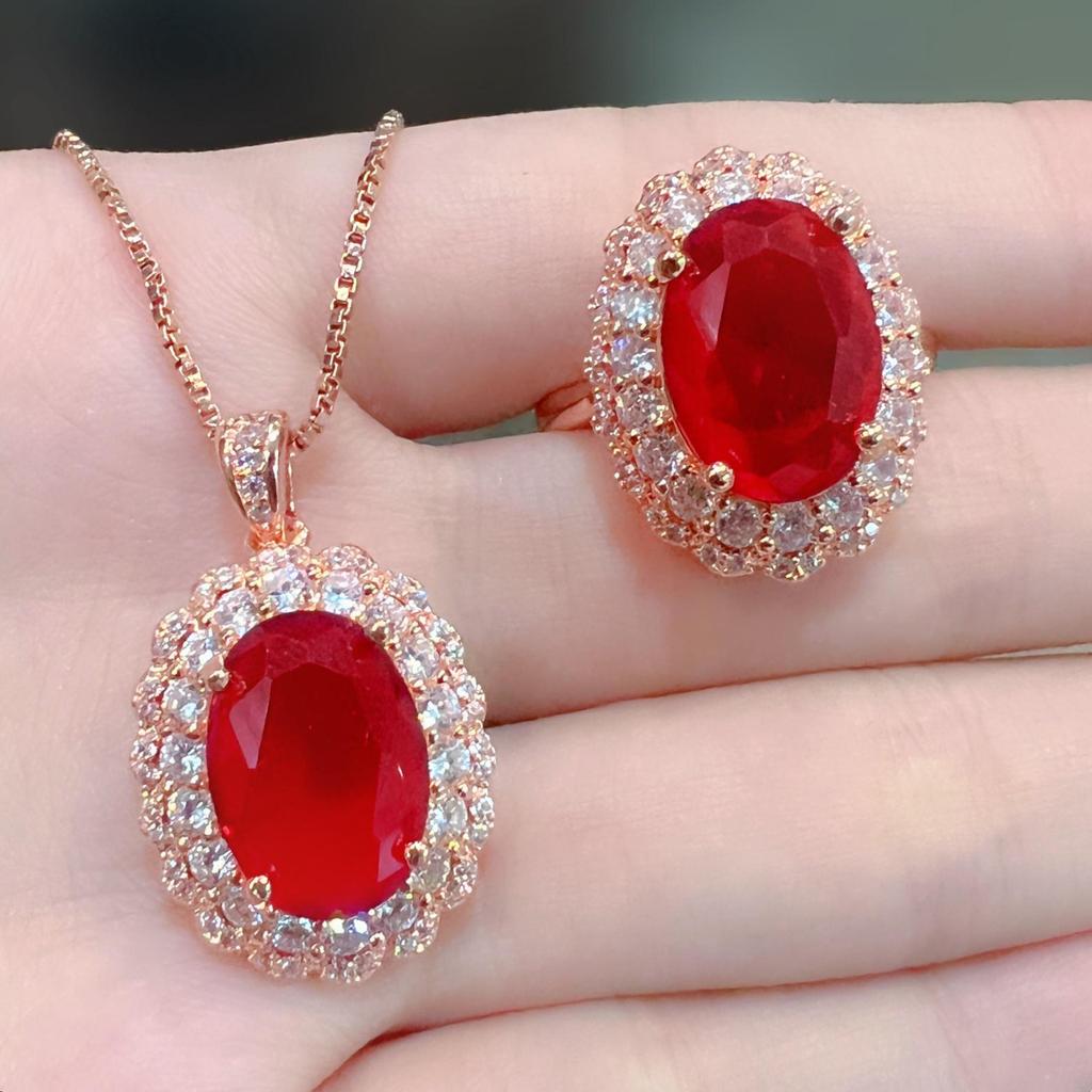 Комплект украшений для предложения руки и сердца с рубинами и бриллиантами: Кольцо с четырьмя когтями и ожерелье с подвеской — купить товар онлайн с бесплатной доставкой по всему миру!