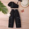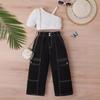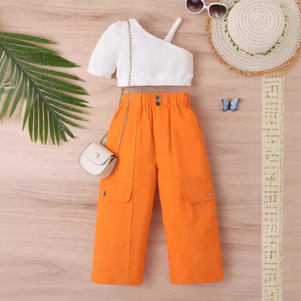 Комплект одежды для девочек: Летний детский однотонный пуловер с короткими рукавами и открытыми плечами, комплект из двух предметов с цветными джинсовыми брюками — купить товар онлайн с бесплатной доставкой по всему миру!