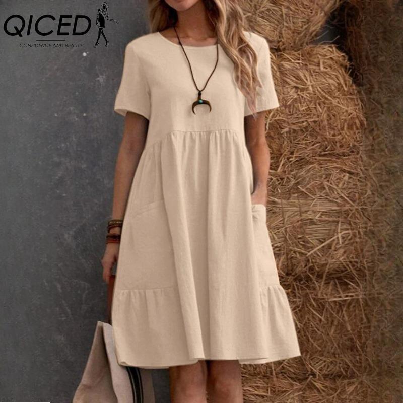 QICED Женская мода лето весна однотонный принт О-образный вырез высокая талия повседневные платья
