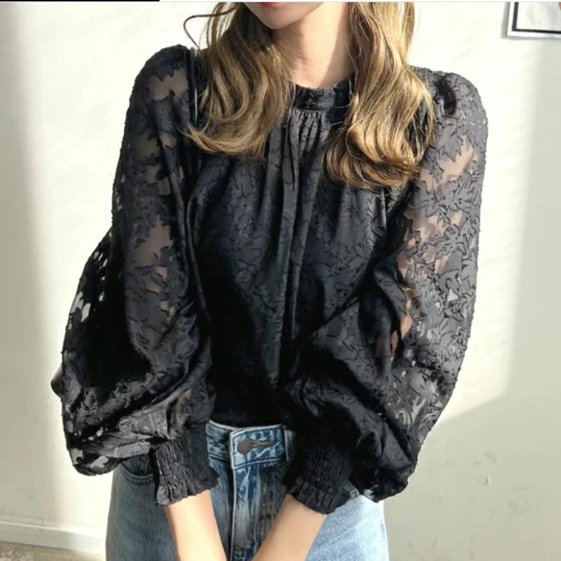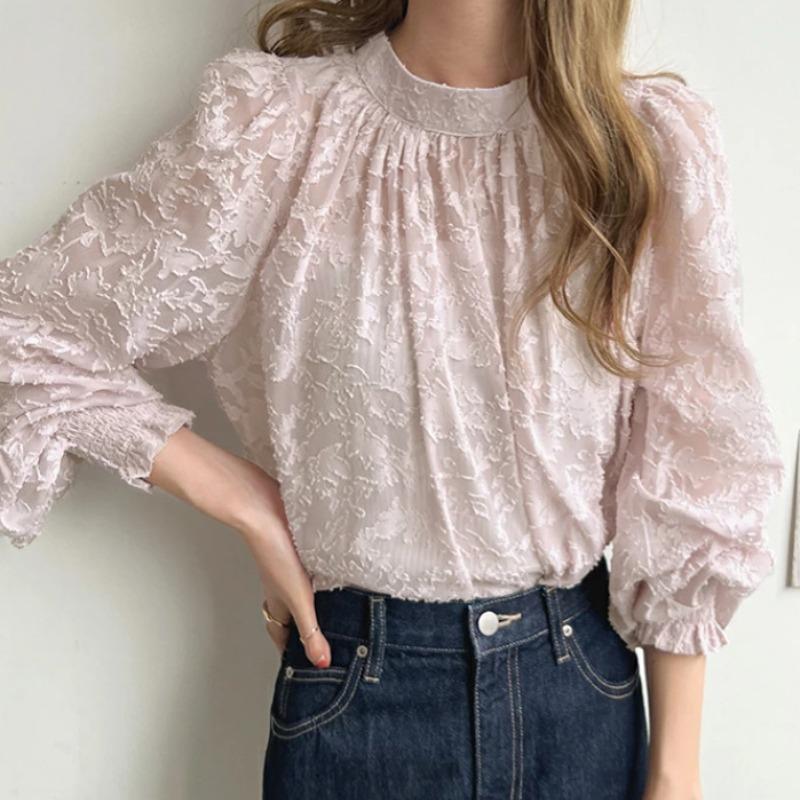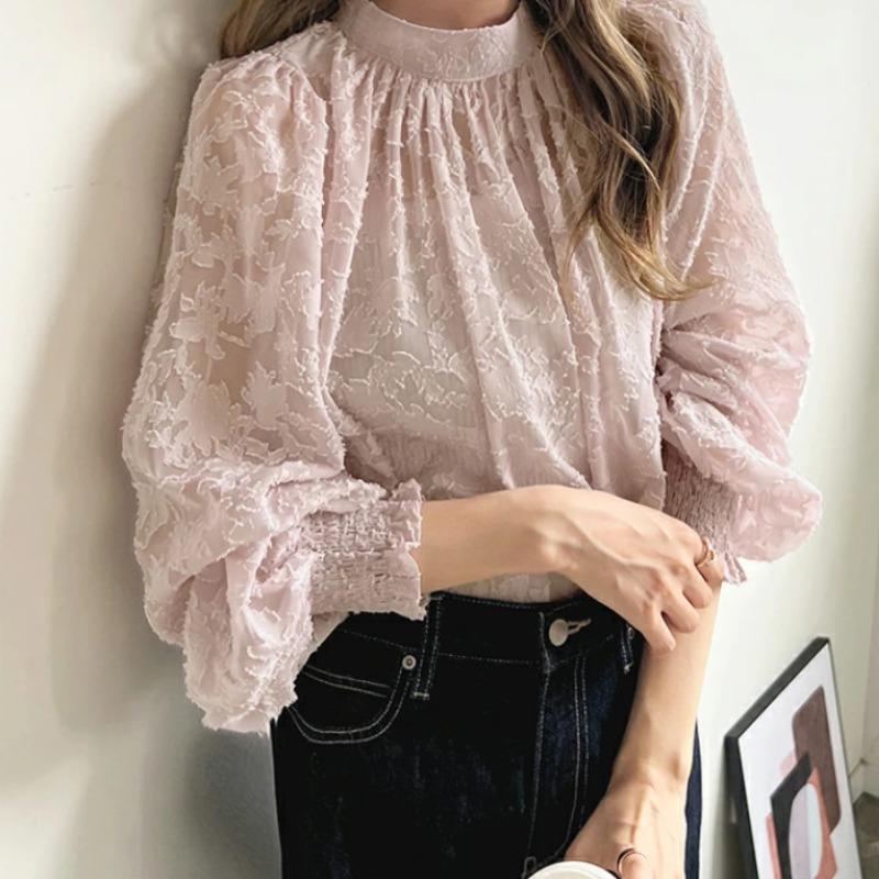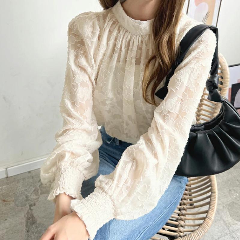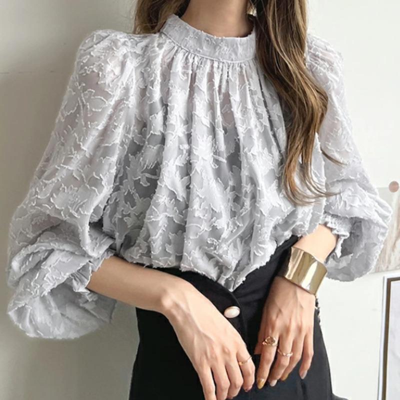 Модные новые повседневные рубашки с длинным рукавом, женские кружевные топы, элегантные воротник-стойка, облегающие свободные женские блузки, винтажные однотонные цветы, шифоновая женская рубашка 26363
