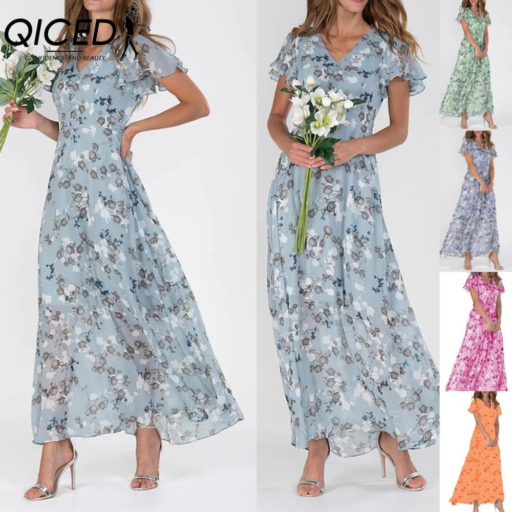 QICED 6-цветное платье макси с V-образным вырезом и оборками, короткие рукава, приталенная талия, высокая талия, струящийся подол, милое цветочное шифоновое платье, женская одежда