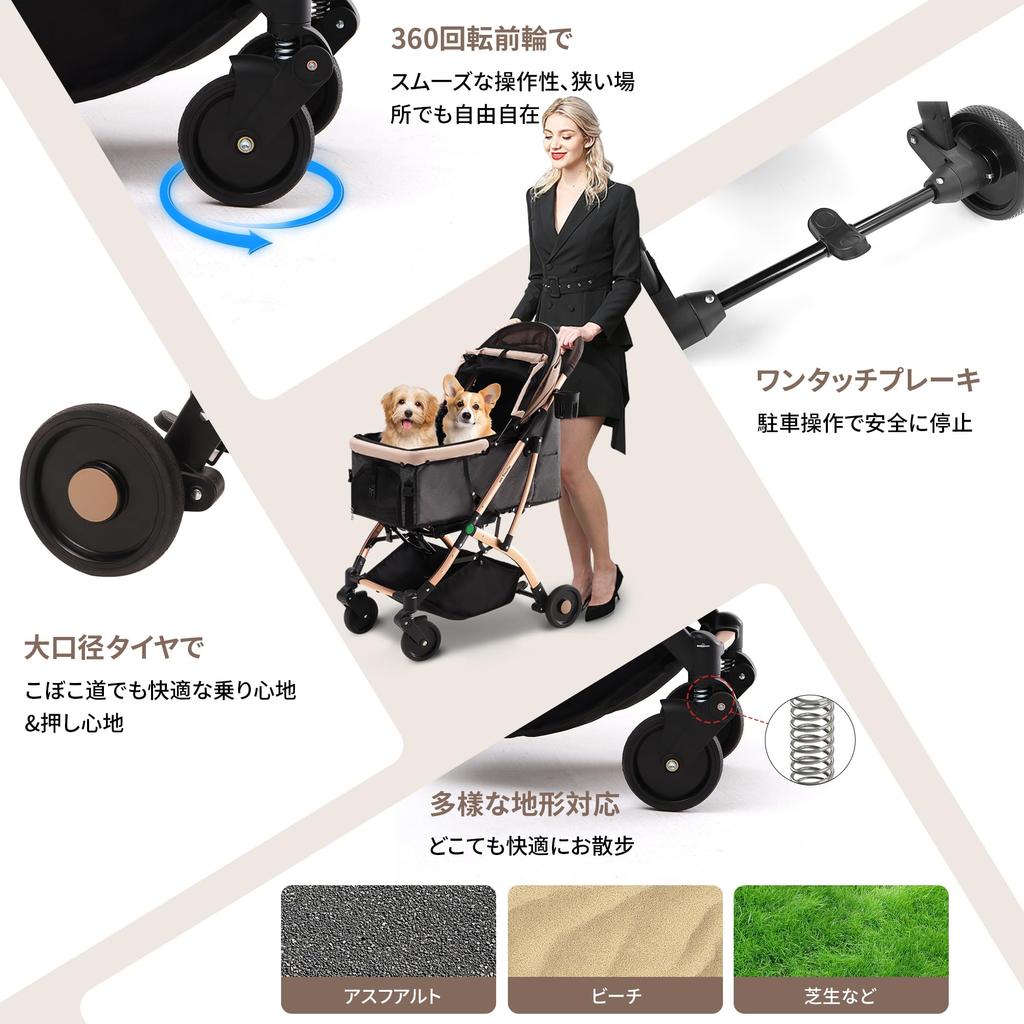 [Отличная устойчивость] Передние колеса, вращающиеся на 360° влево и вправо, маневренны, что облегчает изменение направления.. Используется встроенная подвеска и более износостойкий материал ПУ + ЭВА. Большие колеса используются для уменьшения вибрации от дорожного покрытия, что делает движение шины очень плавным.. В комплект входит стопор для ноги, поэтому вы можете быть уверены, останавливая коляску на остановке или на склоне! Поставляется с 2 поводками против прыжков, так что вам не придется беспокоиться о том, что ваш питомец сбежит сам.. [Отлично подходит для многих мест] Есть много ситуаций, когда полезна тележка для питомца, например, поездка в парк или пригород, в поезде, в больнице, возвращение домой, путешествия, собачьи кафе и мероприятия для питомцев. Рекомендуется для собак мелких и средних размеров, а также для тех, кто держит несколько собак!