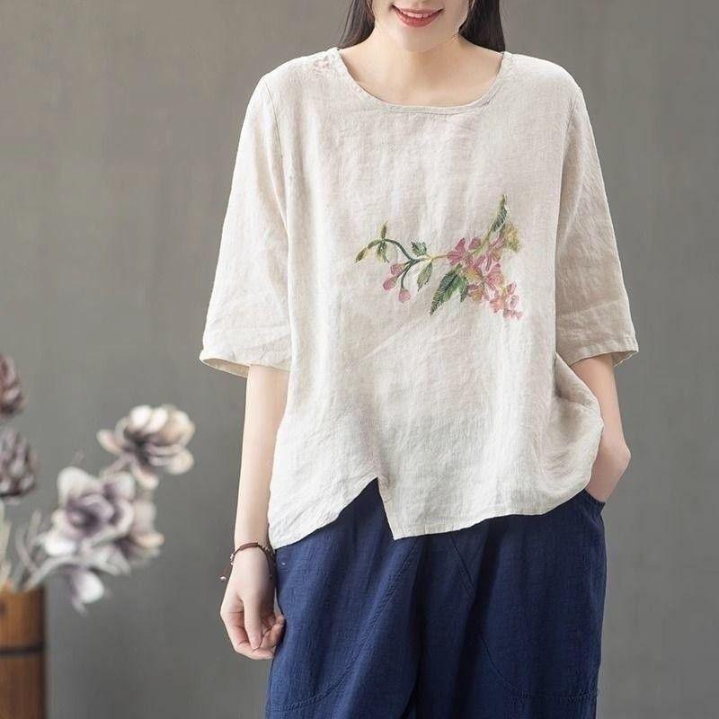 Хлопковый и льняной топ для женщин на лето, новая тонкая вышитая футболка большого размера для женщин, свободная футболка в литературном ретро-китайском национальном стиле