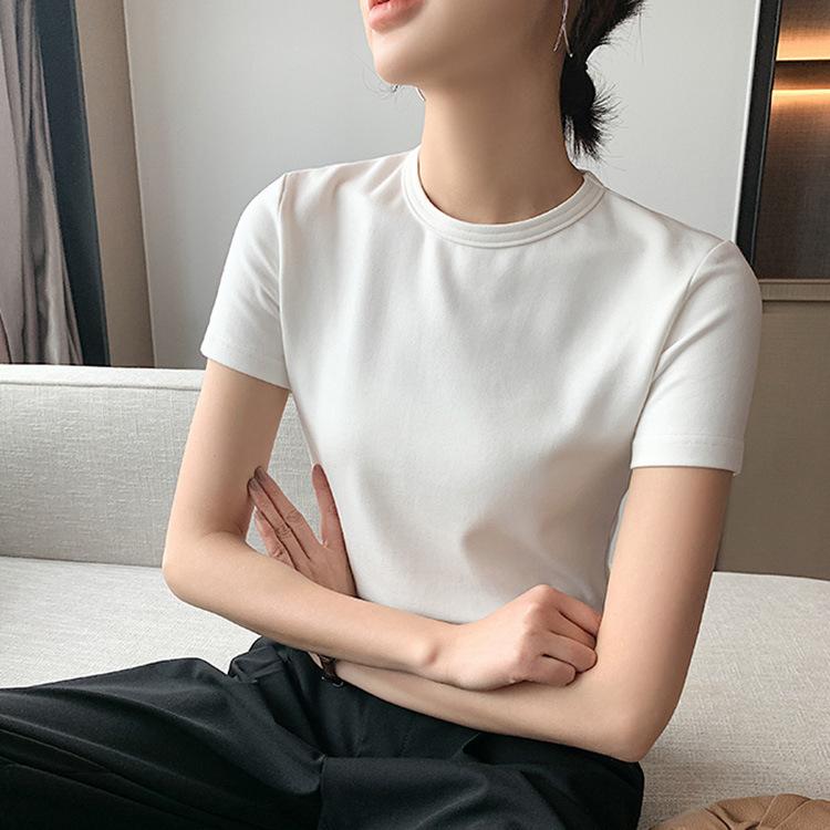 Повседневная футболка с круглым вырезом и короткими рукавами для женщин, однотонная, из нового мерсеризованного хлопка, простой облегающий и универсальный топ, свободного кроя