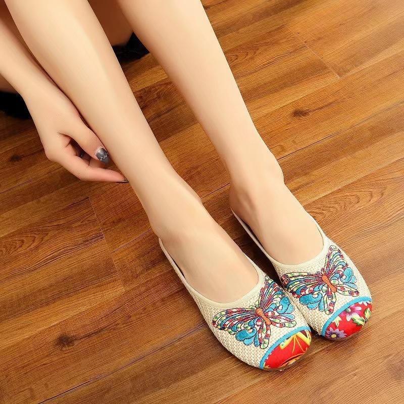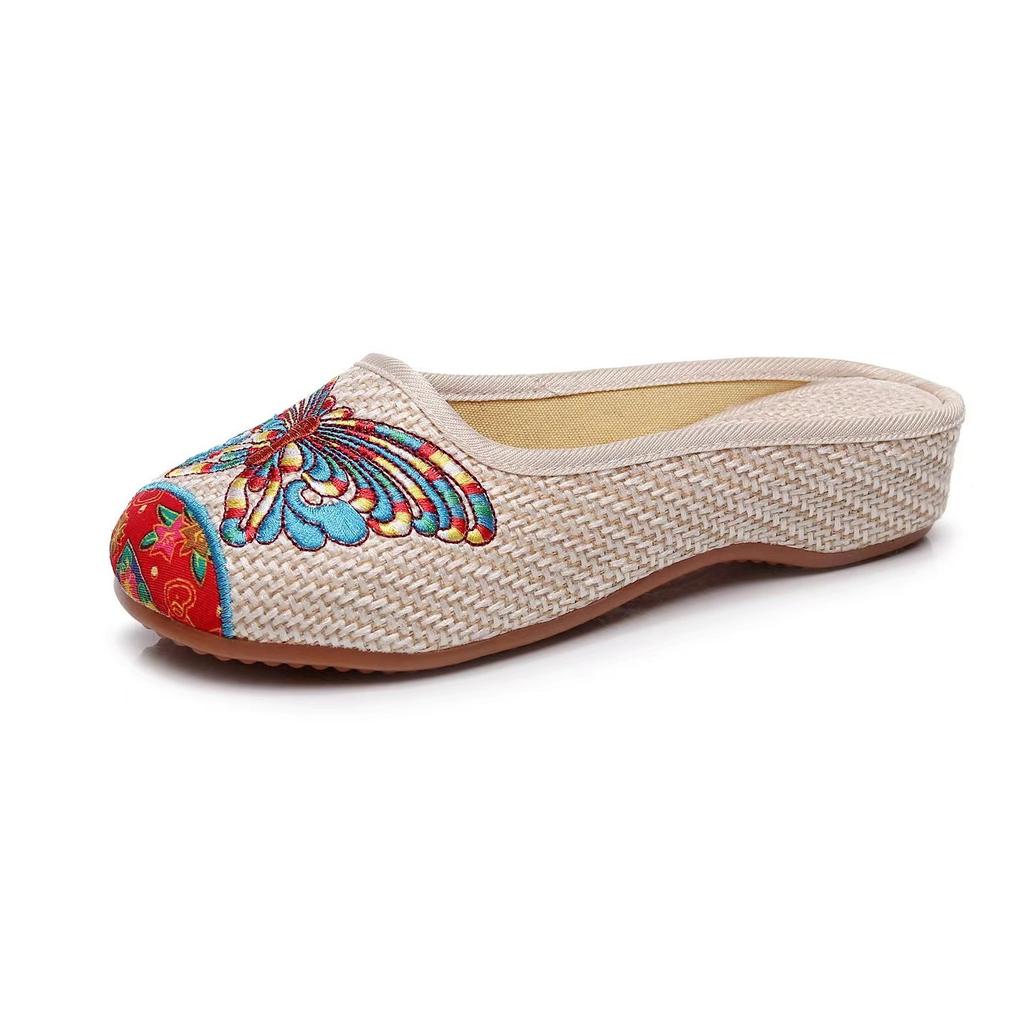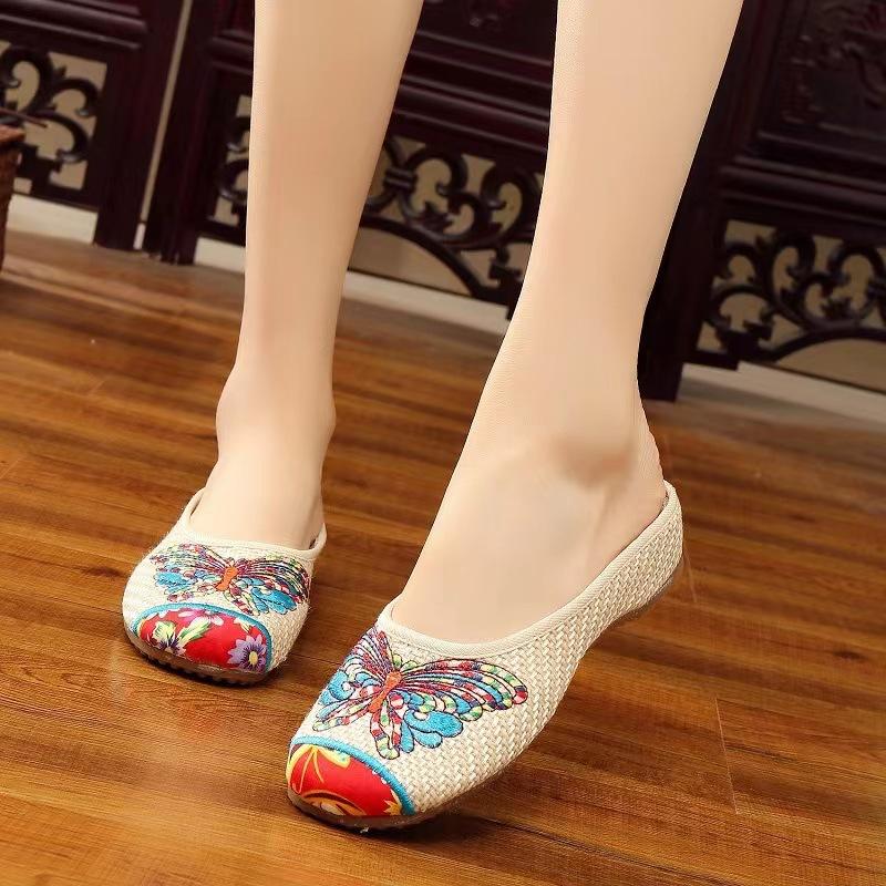 Тапочки с вышитыми бабочками, женская тканевая обувь, сандалии с сумкой на голову, летняя прогулочная обувь в этническом стиле, тапочки из говяжьей сухожилия в старом пекинском стиле