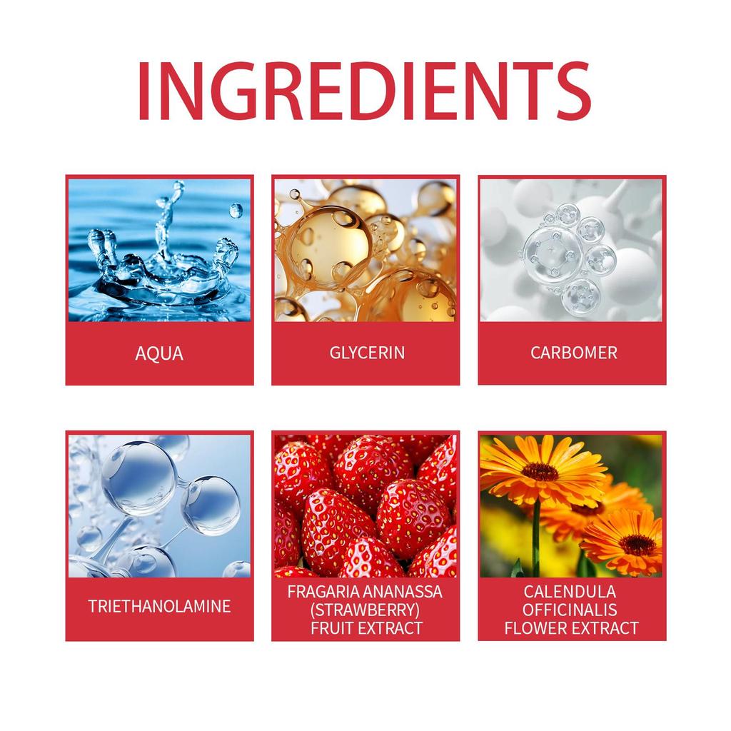 ВОДА, ГЛИЦЕРИН, КАРБОМЕР, ТРИЭТАНОЛАМИН, ФРАГАРИЯ АНАНАССА (КЛУБНИКА) ЭКСТРАКТ ПЛОДОВ, ЭКСТРАКТ ЦВЕТКОВ КАЛЕНДУЛЫ ЛЕКАРСТВЕННОЙ