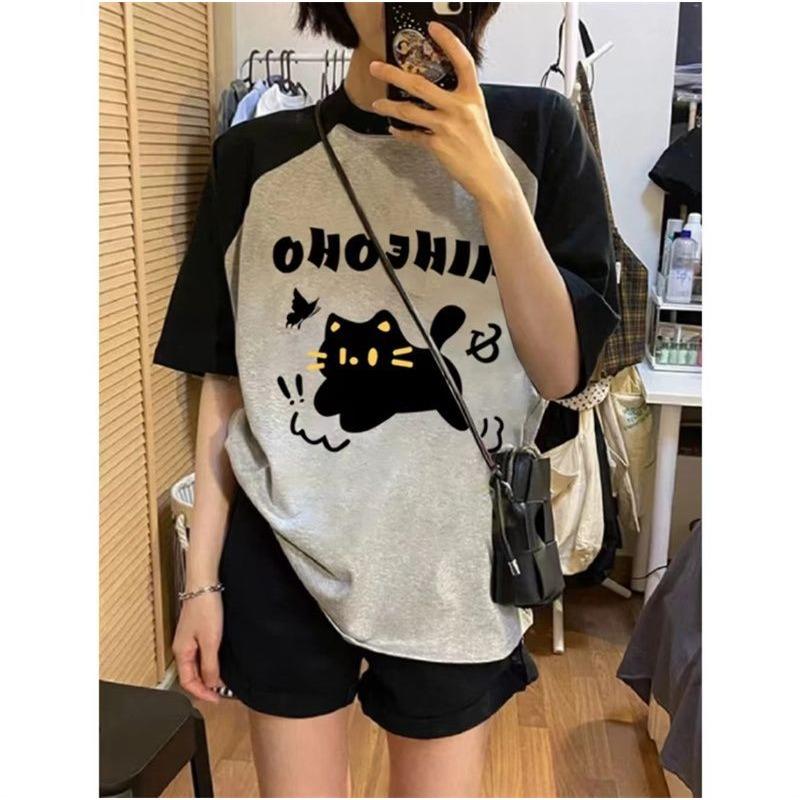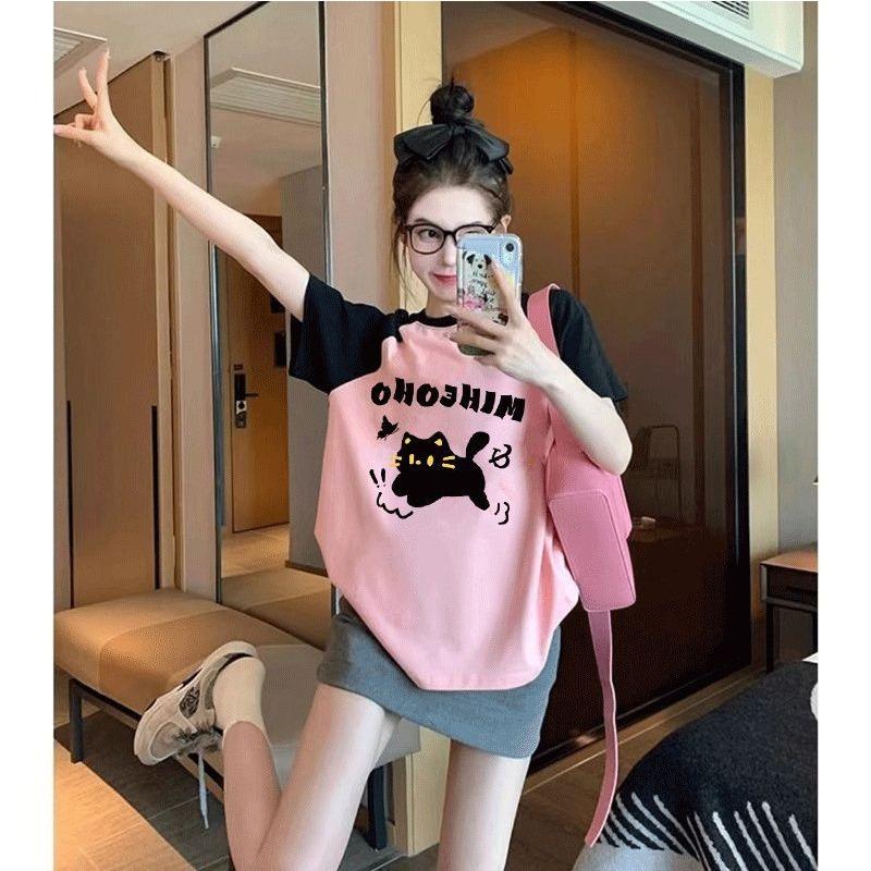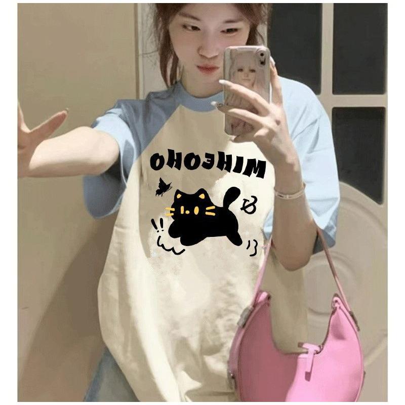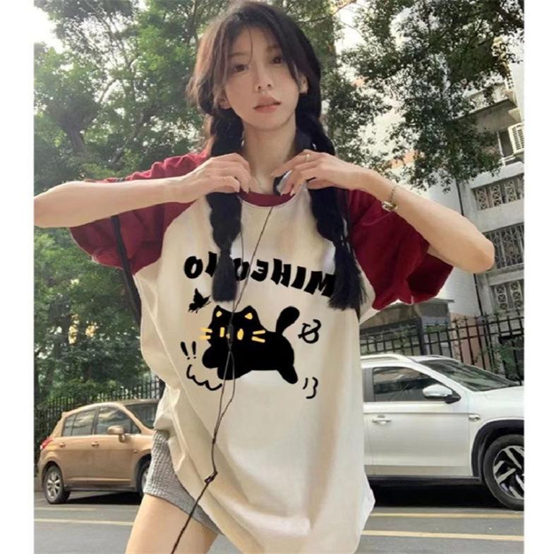 Свободная большая версия падающей плечевой цветной вставки с роговыми рукавами и короткими рукавами для женщин на весну и лето, новый дизайн, повседневный хлопковый топ
