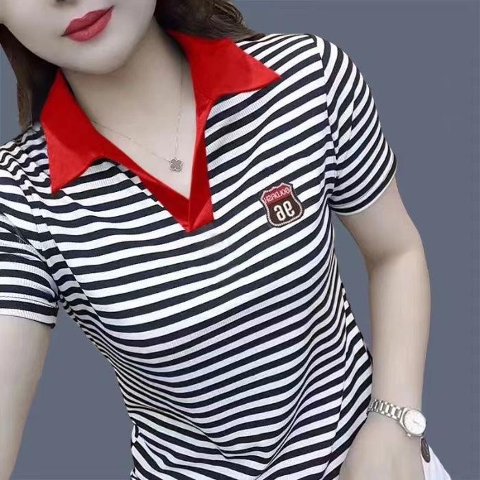 Рубашка поло Футболка с короткими рукавами Женская летняя новая полосатая тонкая и модная универсальная футболка