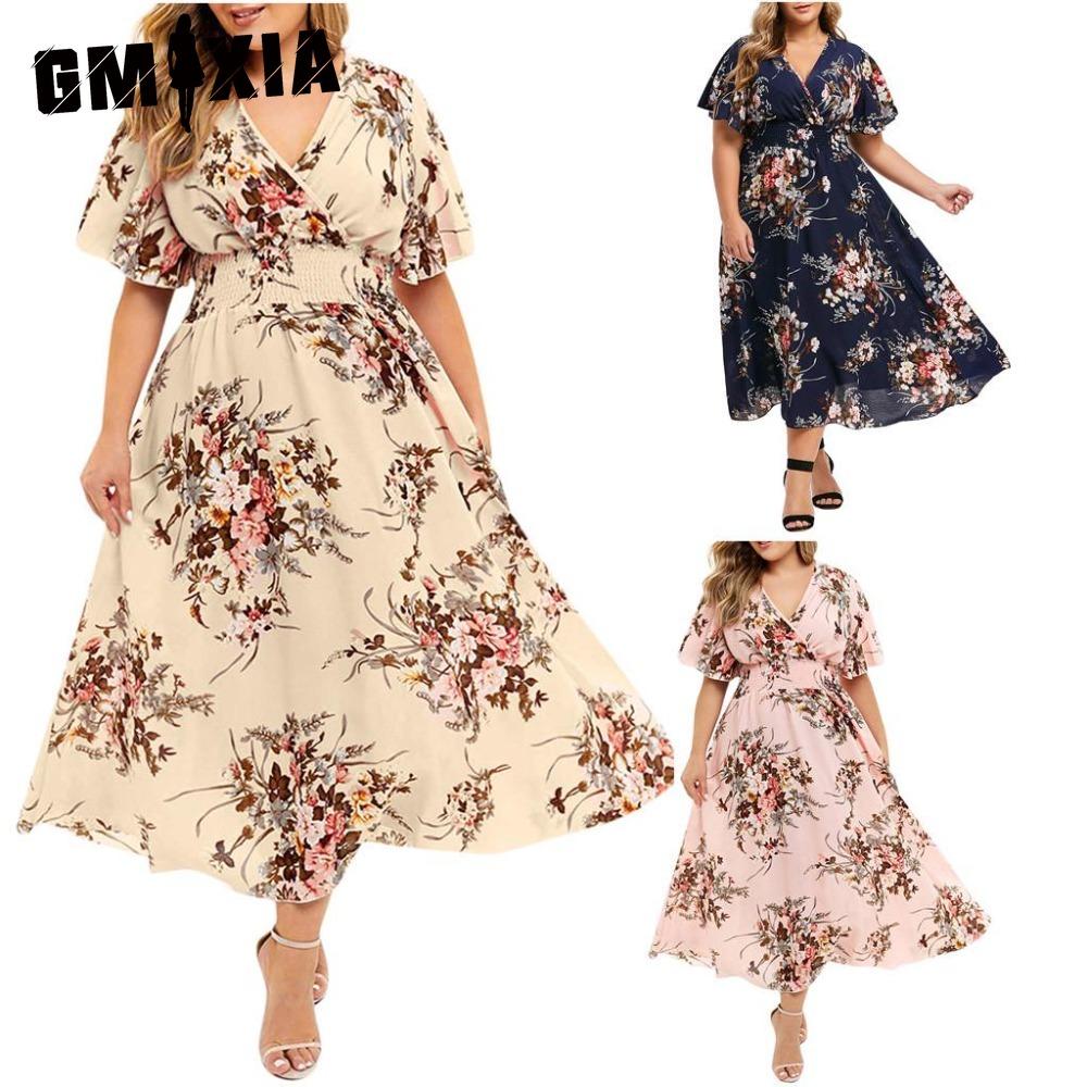 GMXIA Плюс Размер Моды Женщин Повседневный Цветочный Принт V Образным Вырезом Короткое Платье