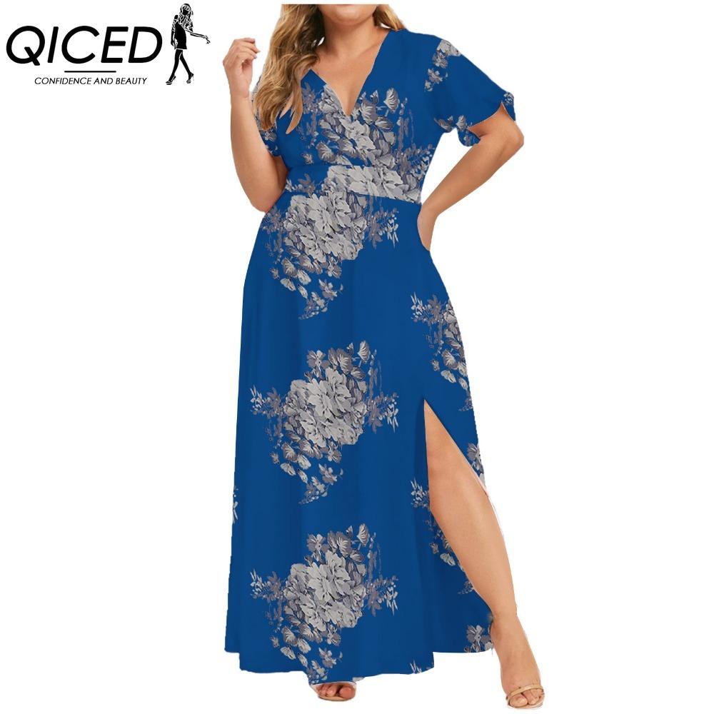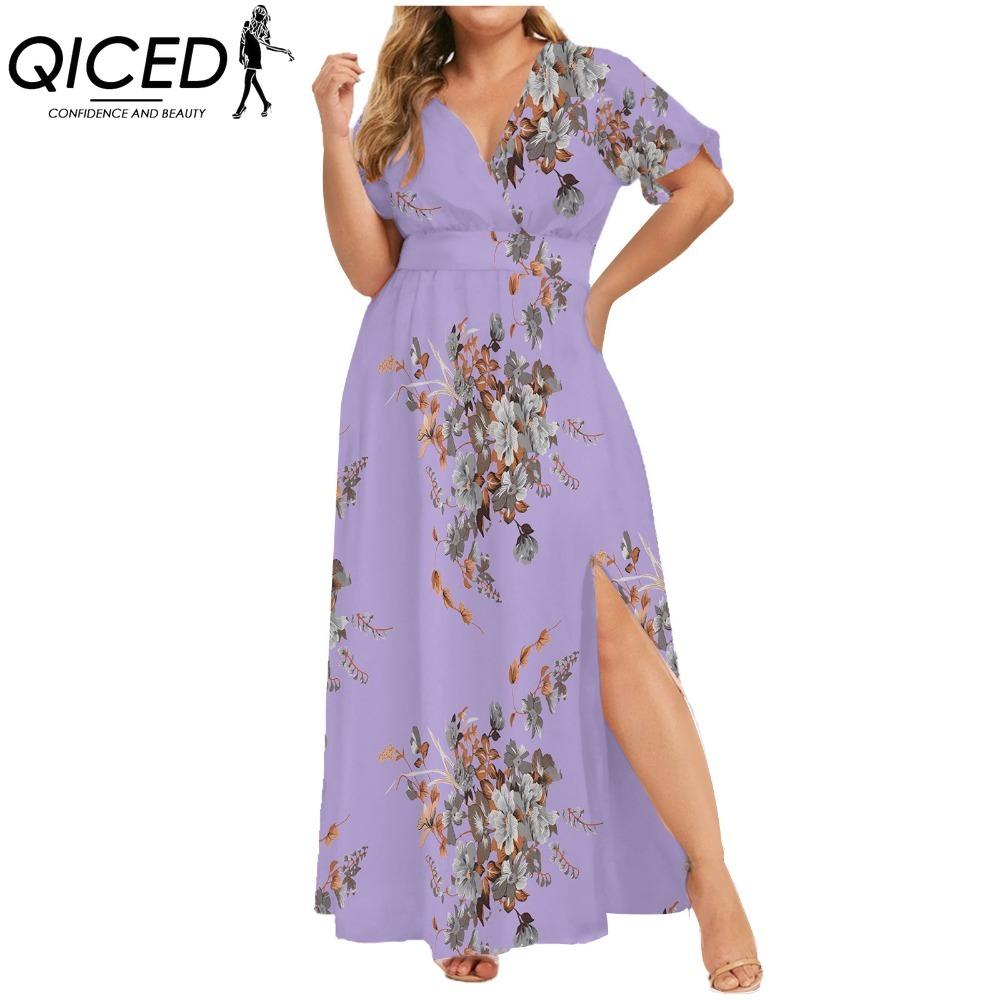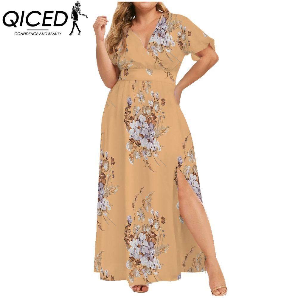 QICED L-5XL Женская мода лето весна короткий рукав V-образный вырез повседневные платья