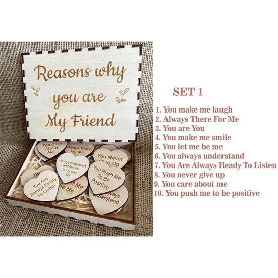 В каждый набор входит 1 деревянная коробка и 10 деревянных карточек в форме сердечек, на которых выгравированы мотивационные цитаты для ежедневного поощрения.