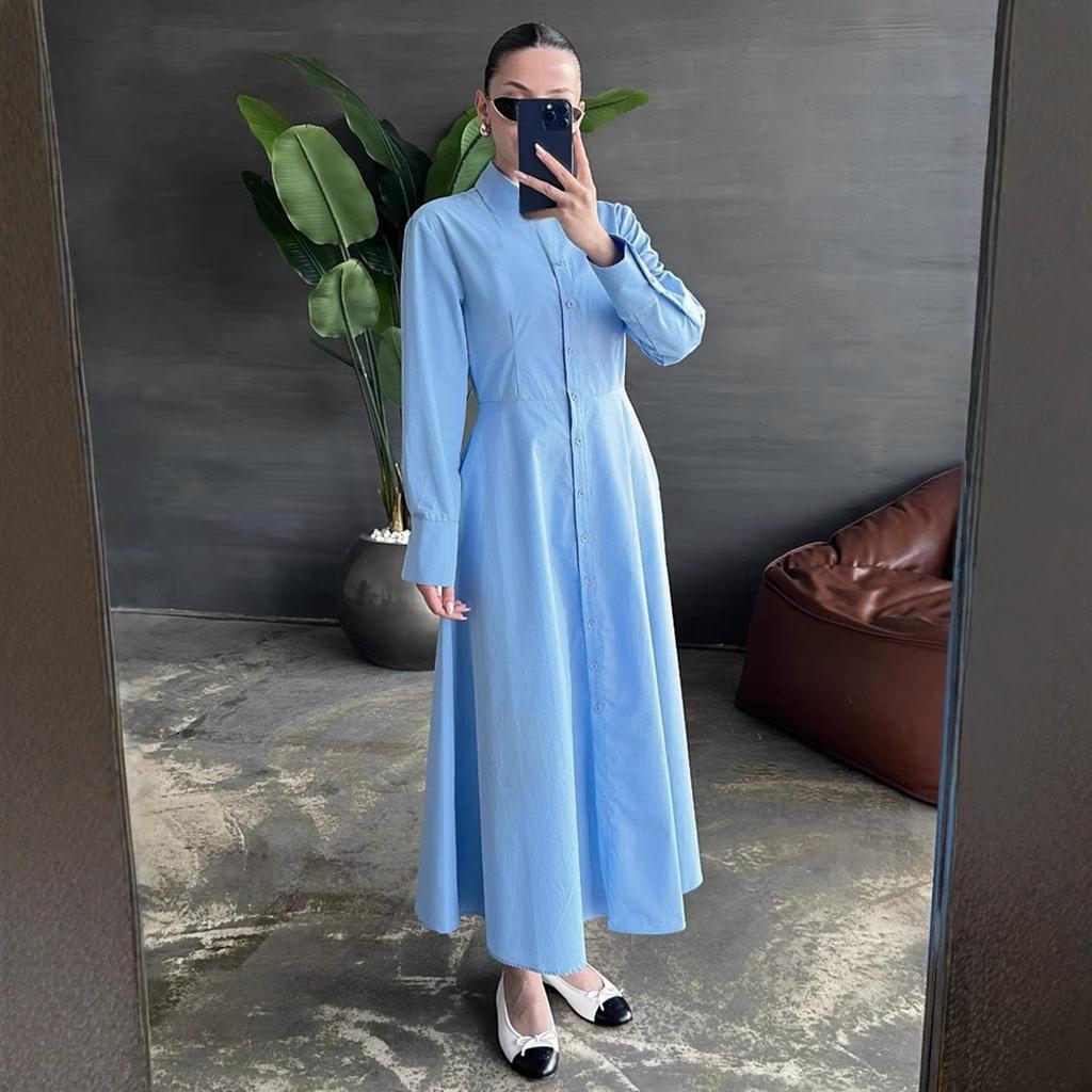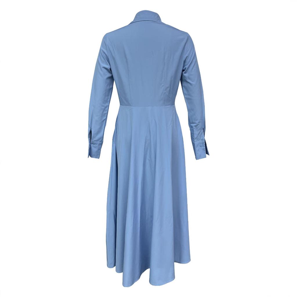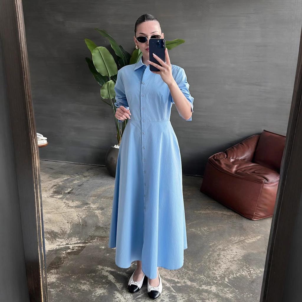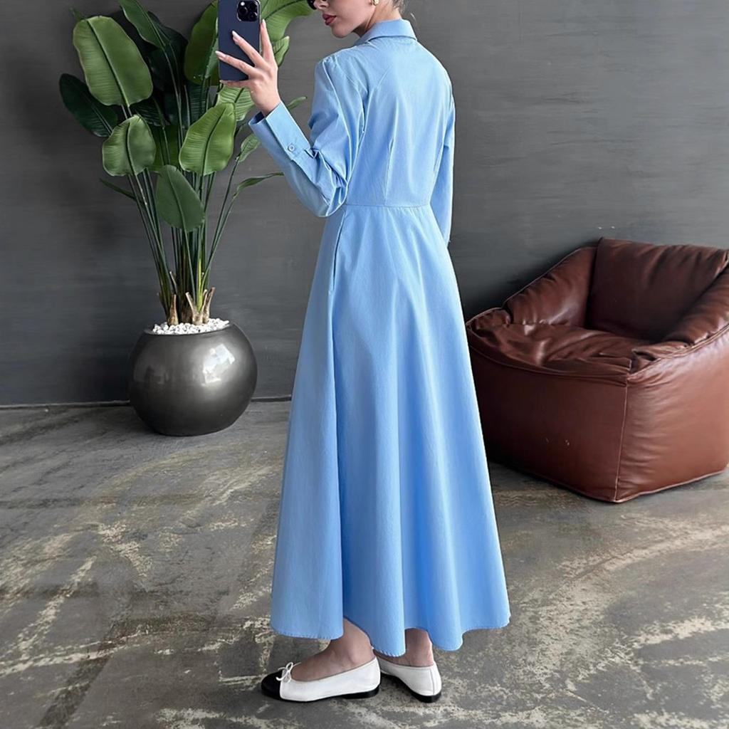 Женское простое однобортное платье-рубашка синего цвета с лацканами, повседневное, элегантное, с длинными рукавами