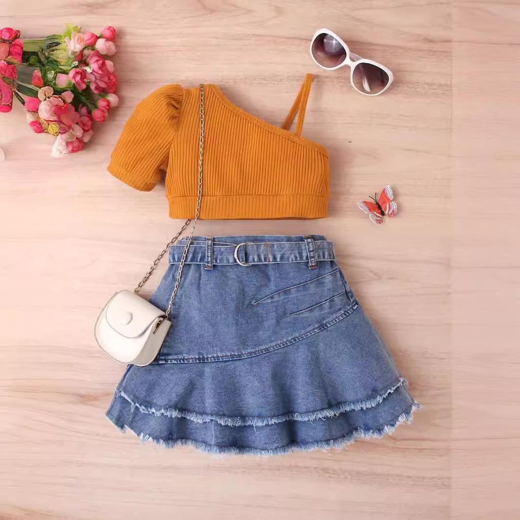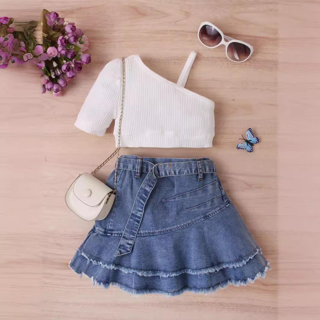 Костюм для девочек, летний детский однотонный топ с короткими рукавами, джинсовая плиссированная короткая юбка, пояс для костюма