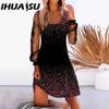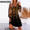 IHUASU Женская мода весна осень однотонный принт длинный рукав U-образный вырез высокая талия повседневные платья