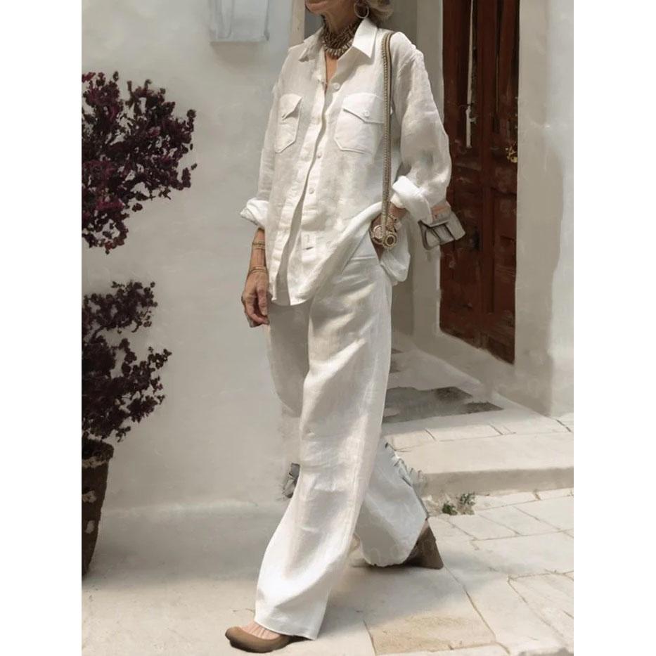 Модные свободные брюки из хлопка и льна, зеленые комплекты, женская рубашка с лацканами на весну и осень, однотонные широкие брюки с карманами, комплекты из двух предметов