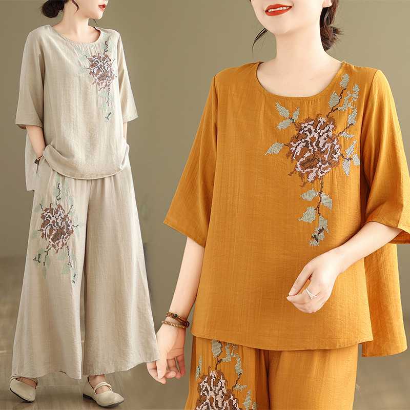 Художественный хлопковый льняной топ с вышивкой и повседневные широкие брюки, комплект из двух предметов для женщин, летний однотонный ансамбль