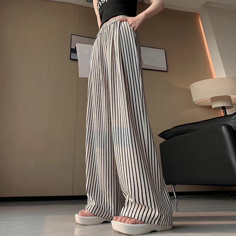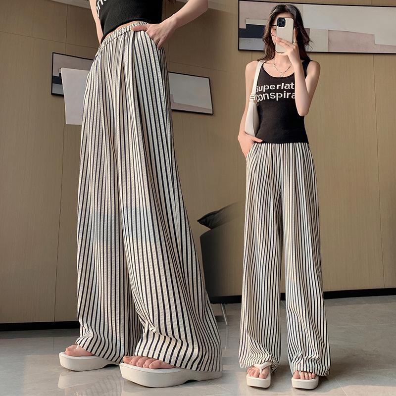 Легкие полосатые брюки из ледяного шелка с широкими штанинами, женские летние тонкие брюки с высокой талией и защитой от солнца, повседневные свободные прямые брюки