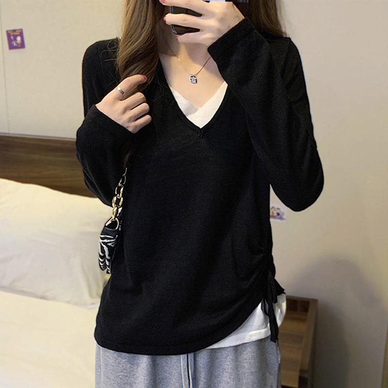 Большой размер Fat Girl Fake Двухсекционный топ с V-образным вырезом для женщин с тонким внутренним длинным рукавом, дизайн рубашки, вязаный свитер с длинными рукавами