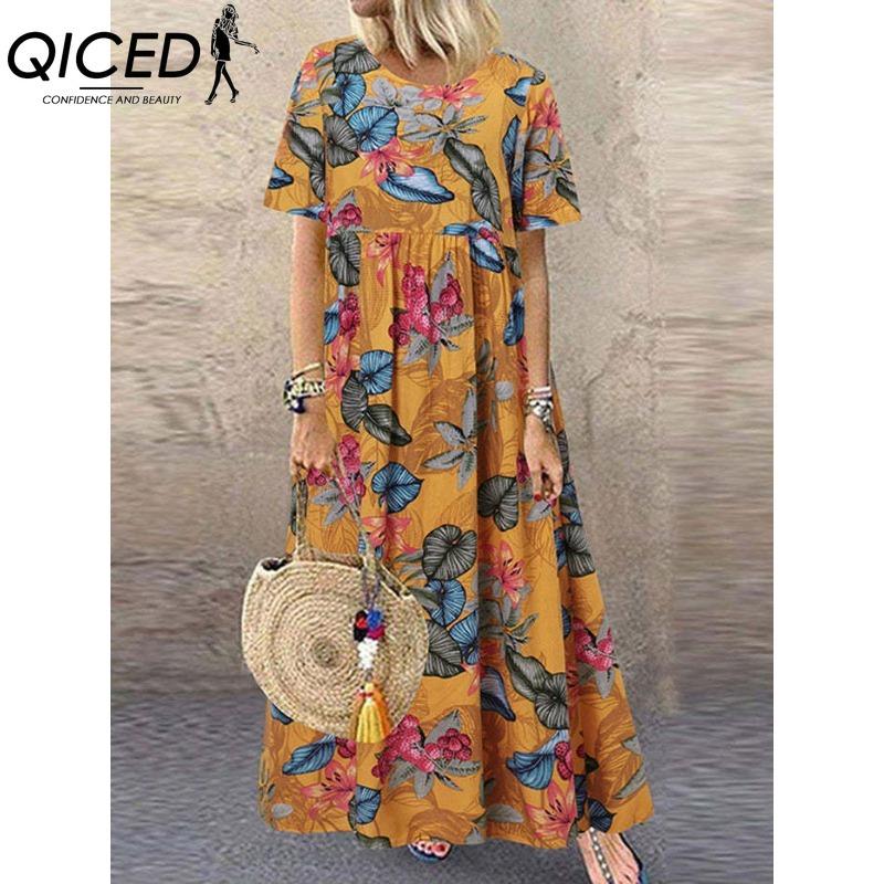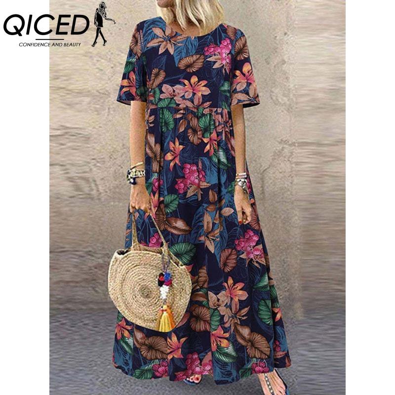 QICED Женская мода лето весна однотонный принт с коротким рукавом и круглым вырезом с высокой талией повседневные платья