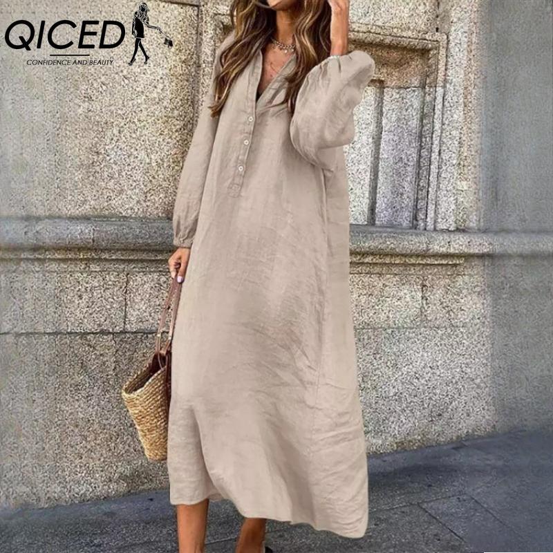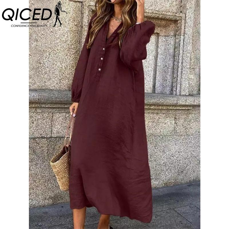 QICED Женская мода весна осень однотонный принт с длинным рукавом и высокой талией повседневные платья