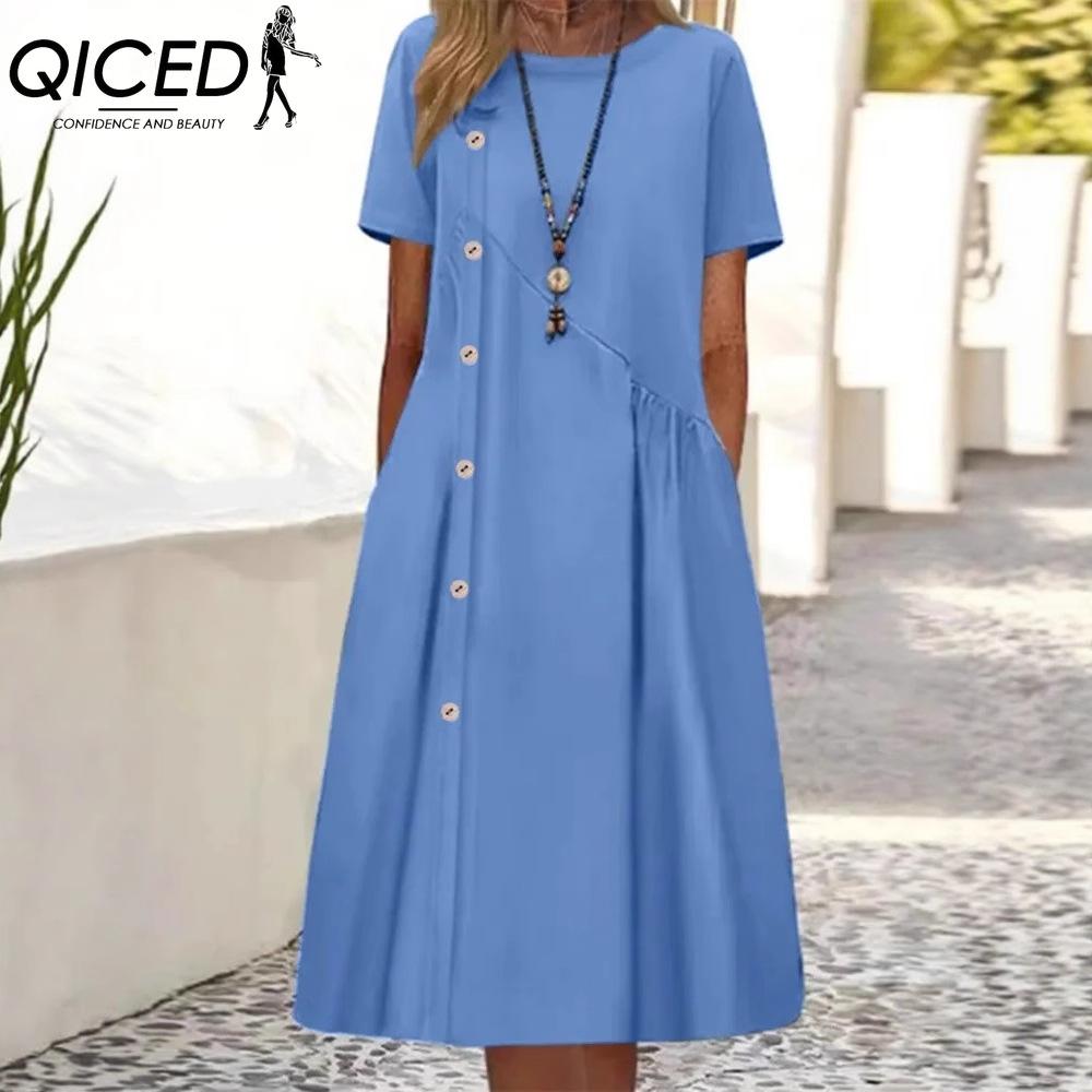 QICED женские модные летние весенние однотонные повседневные платья с коротким рукавом и круглым вырезом с высокой талией и принтом — купить товар онлайн с бесплатной доставкой по всему миру!