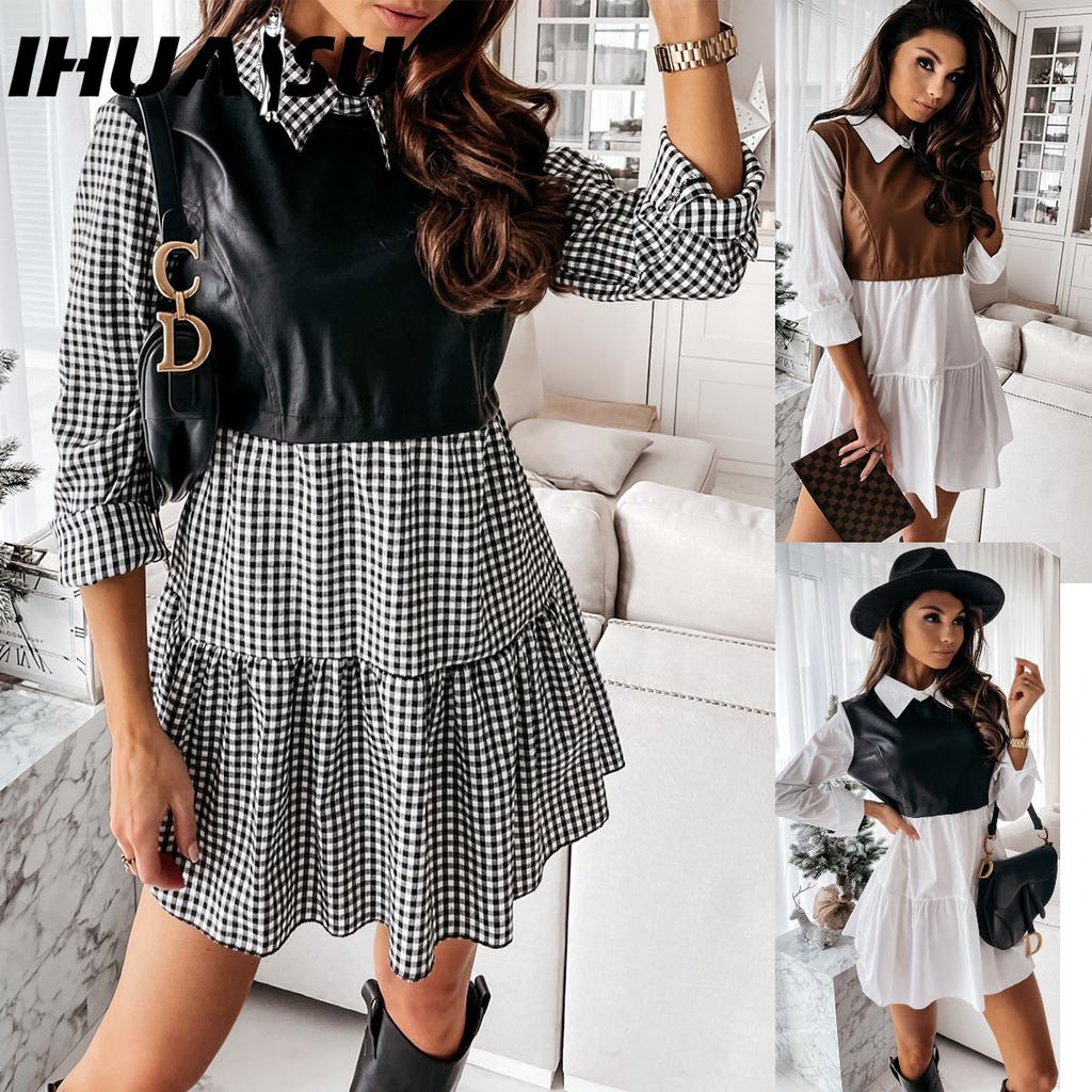 IHUASU Модное женское кожаное платье Пэчворк Клетчатое мини-платье Вечеринка Повседневная юбка Весеннее платье с оборками — купить товар онлайн с бесплатной доставкой по всему миру!