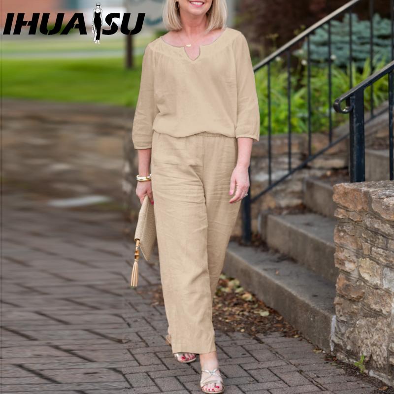 IHUASU Плюс размер Женский повседневный комплект из хлопка с пуговицами, средним рукавом и карманом, однотонный топ и брюки с V-образным вырезом