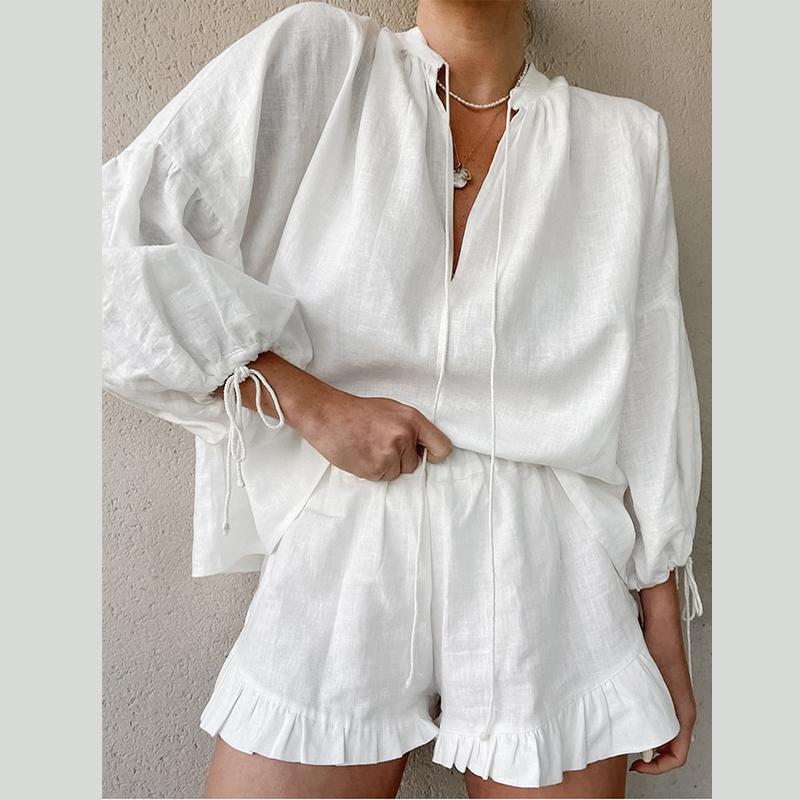 Женские повседневные хлопковые льняные шорты с оборками, льняной пуловер с длинным рукавом и завязками, комплект из 2 предметов, летняя женская пляжная блузка