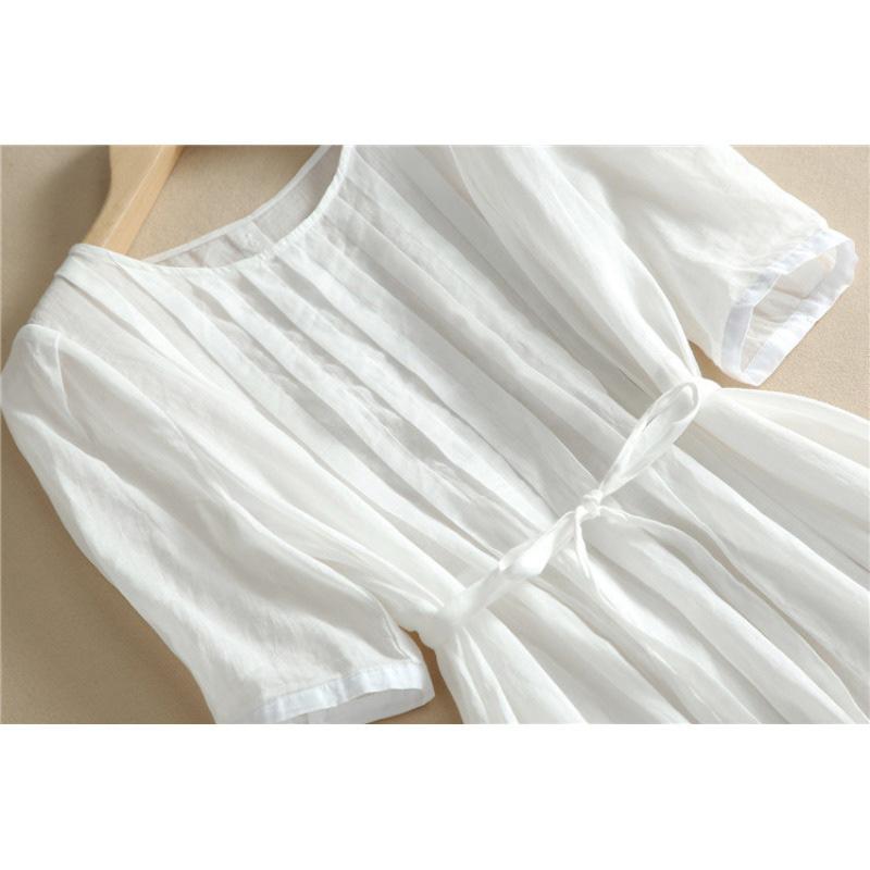 Платье женское 2025 лето новое свободное на шнуровке на талии длинное платье белое отпуск круглый вырез с короткими рукавами длинное платье
