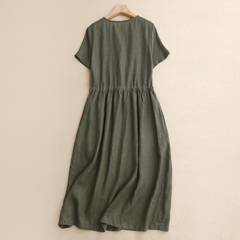Летнее новое платье 2025 года из хлопка и льна однотонной расцветки большого размера для женщин, свободное в талии и стройнящее, с V-образным вырезом и короткими рукавами, средней длины